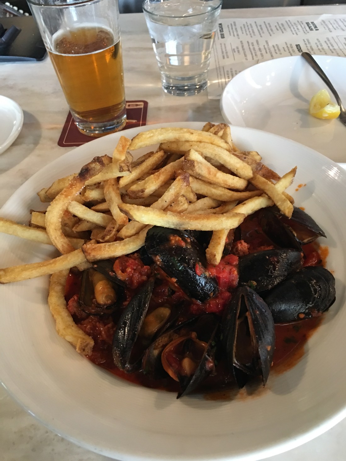 The steamed mussels with roasted tomatoes and chorizo (spiced pork) are superb. The mussels are only $9.00. And add a side of fries and it’s a meal by itself.