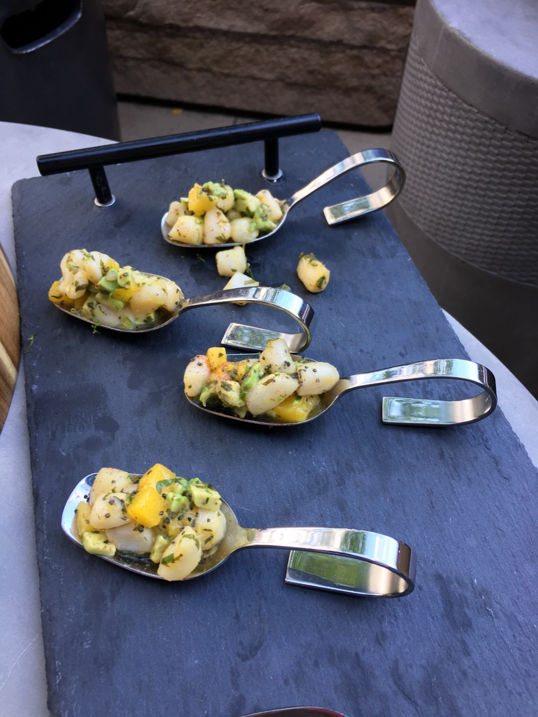 The food included the meat charcuterie board (pictured) which was good. The best item on the board was the house made pickles but there were to few. The other dish was the Scallop Ceviche (pictured). It was okay but it needed more citrus favoring. One of the party had a delicious blueberry and goat cheese dessert.