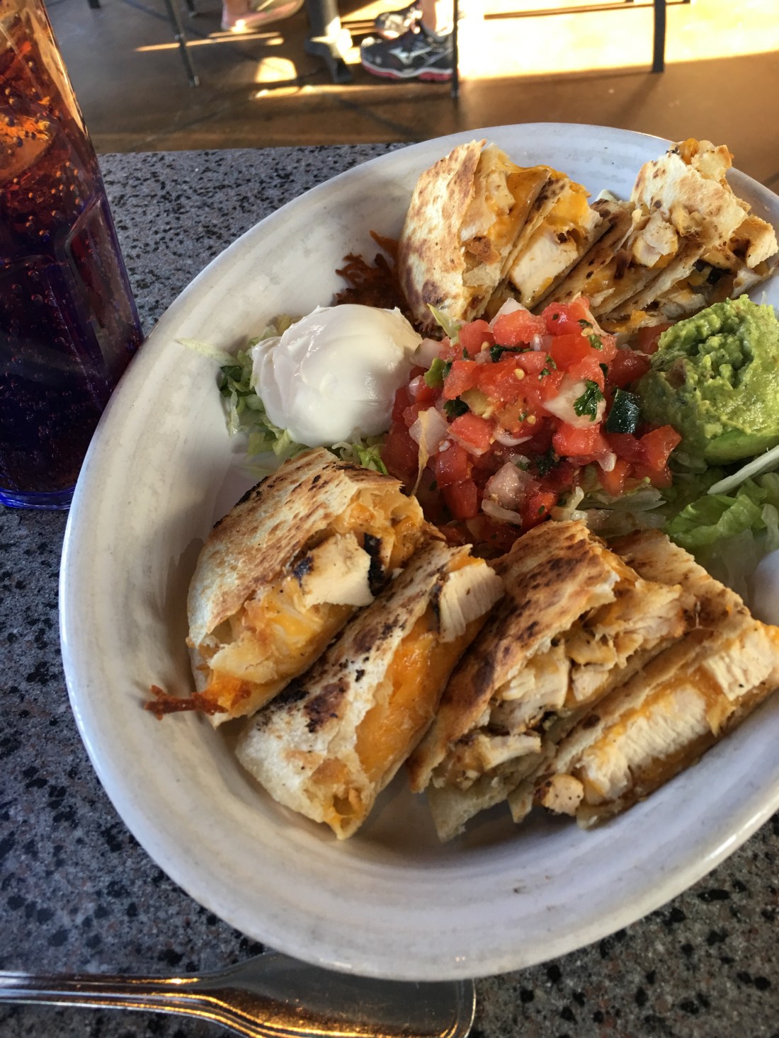 Fish tacos are one of my favorite Mexican dishes but Hacienda Colorado filled the shell with so much sliced cabbage, the fish was lost. The same goes for the shrimp tacos – the shrimp was lost among the toppings. The quesadilla is listed as an appetizer but it is a very large plate. Large, but, once again, flavorless.