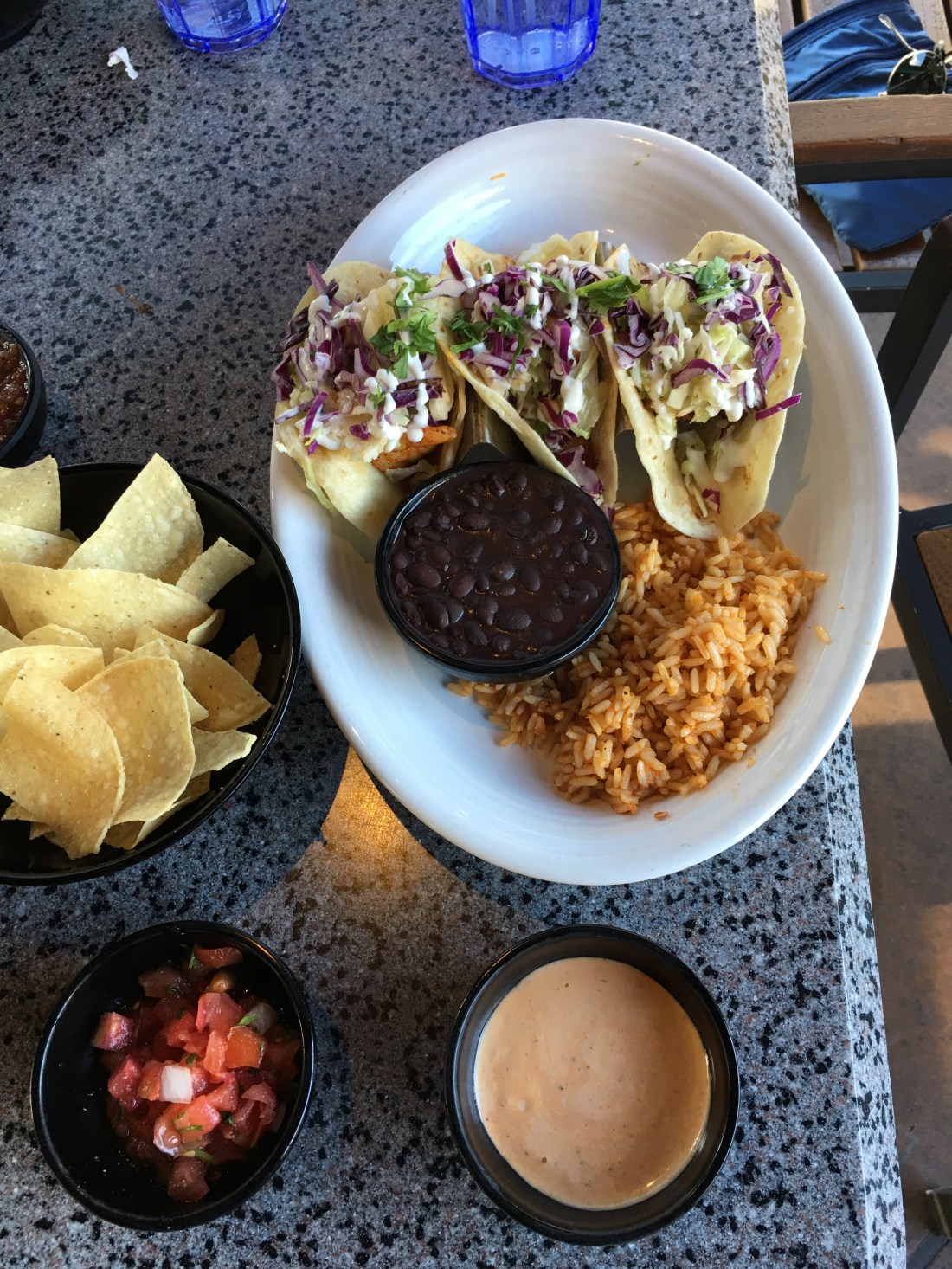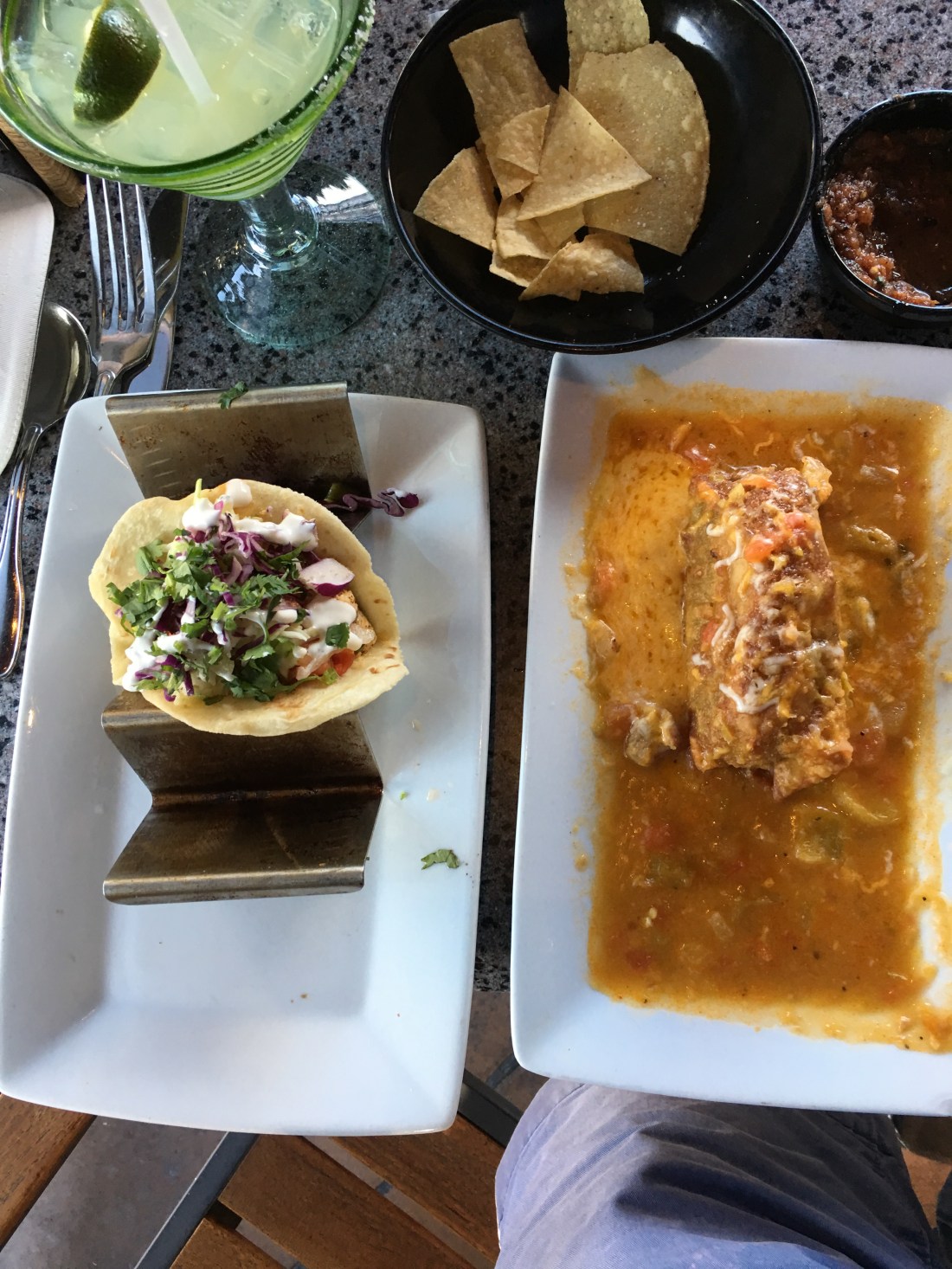 The restaurant is rather dark inside but it has two patio areas. We chose to eat on the patio. We started with a delicious margarita and chips. The main dishes we selected were the chicken and cheese quesadilla, fish tacos and Chile Relleno, and three shrimp tacos. The serving size of the dishes is very large but all four lacked the most important ingredient, flavor!