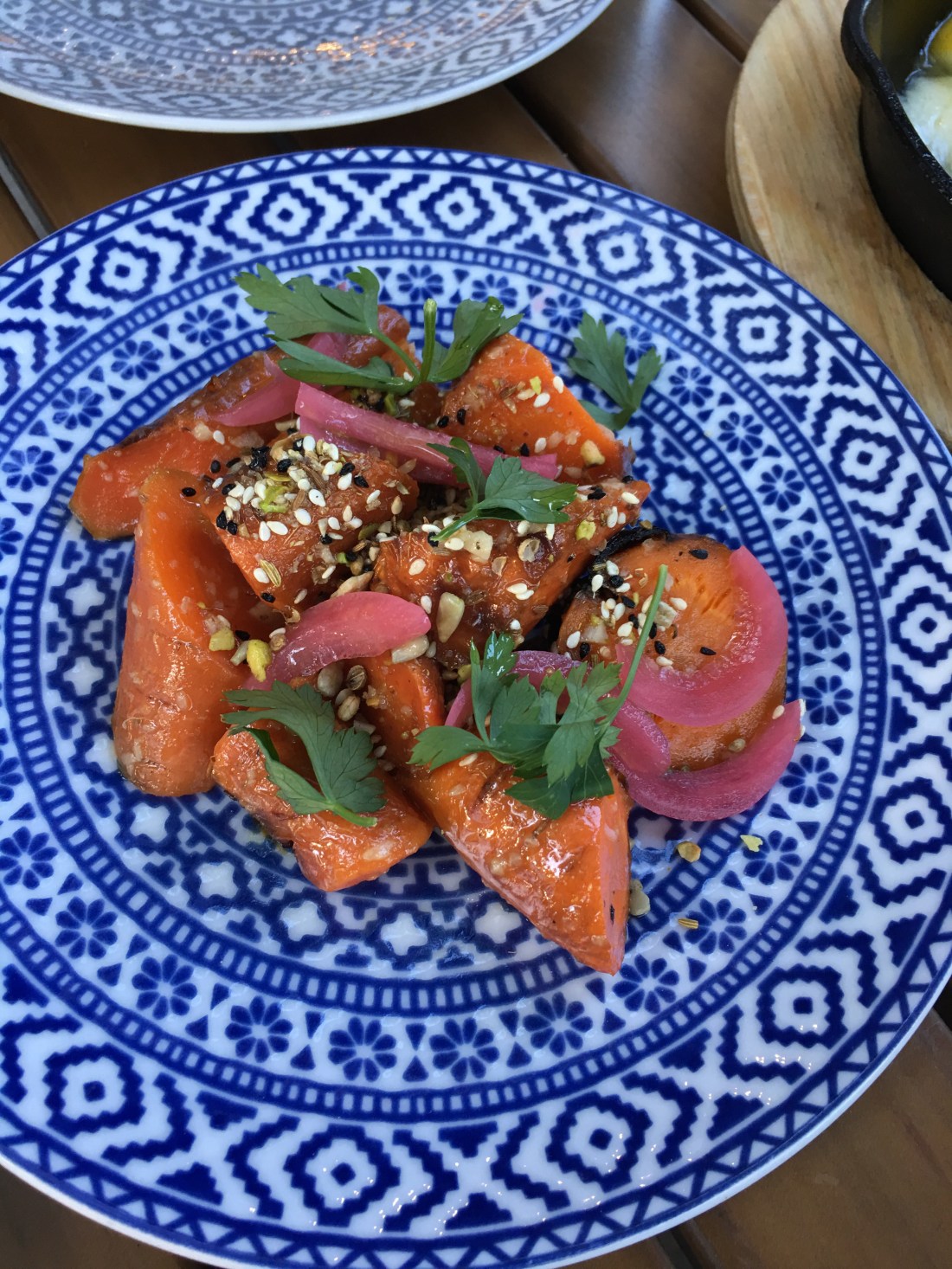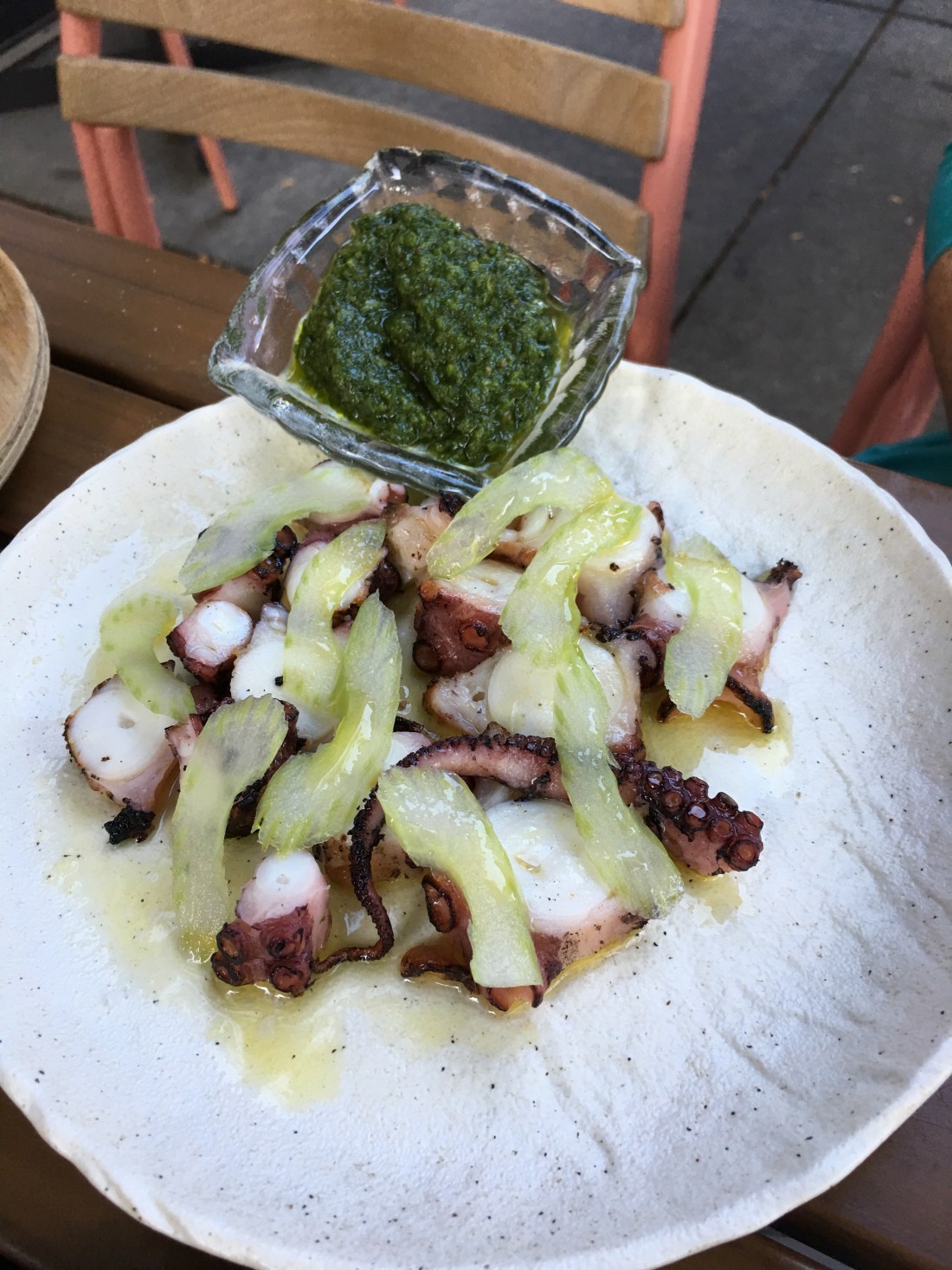 Saganaki is a Greek fried cheese dish served hot in the frying pan. It’s a staple in the country of Greece. Combine the Saganaki with the warm pita bread, it’s makes a beautiful snack. The summer squash presentation was a very pretty dish and tasty. The roasted carrots with spice on the side were also good. The octopus looked great but even with its own spicy sauce, it was disappointing. The loaf of pita bread and vegetable dishes are the definite stars of the menu.