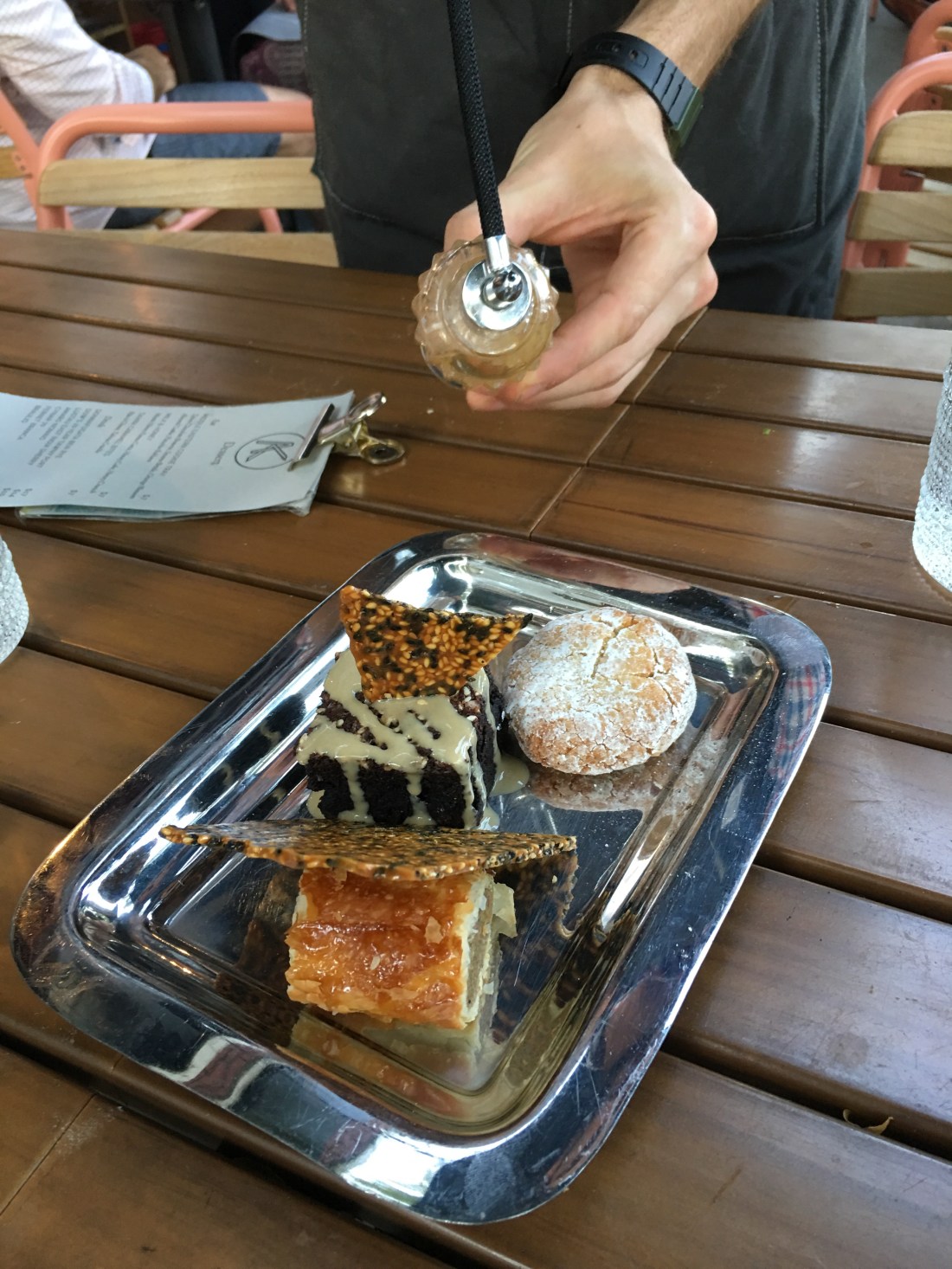 For dessert, the cookie tray is a great way to share. The three cookies were baklava, brownie, and a rose water infused almond cookie. The server actually sprays rosewater on the almond cookie. That is a unique presentation in Denver. The dessert drink was Fernet Branca, explained as a nation-wide drink in Israel, a bitters liquor actually from Italy. After the third sip, it was OK. If you drank this every day, one would understand the hostility among the many groups in the Middle East.