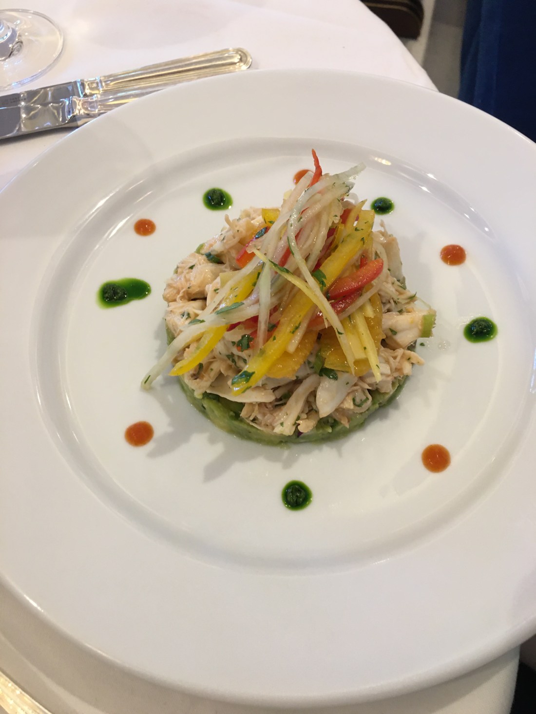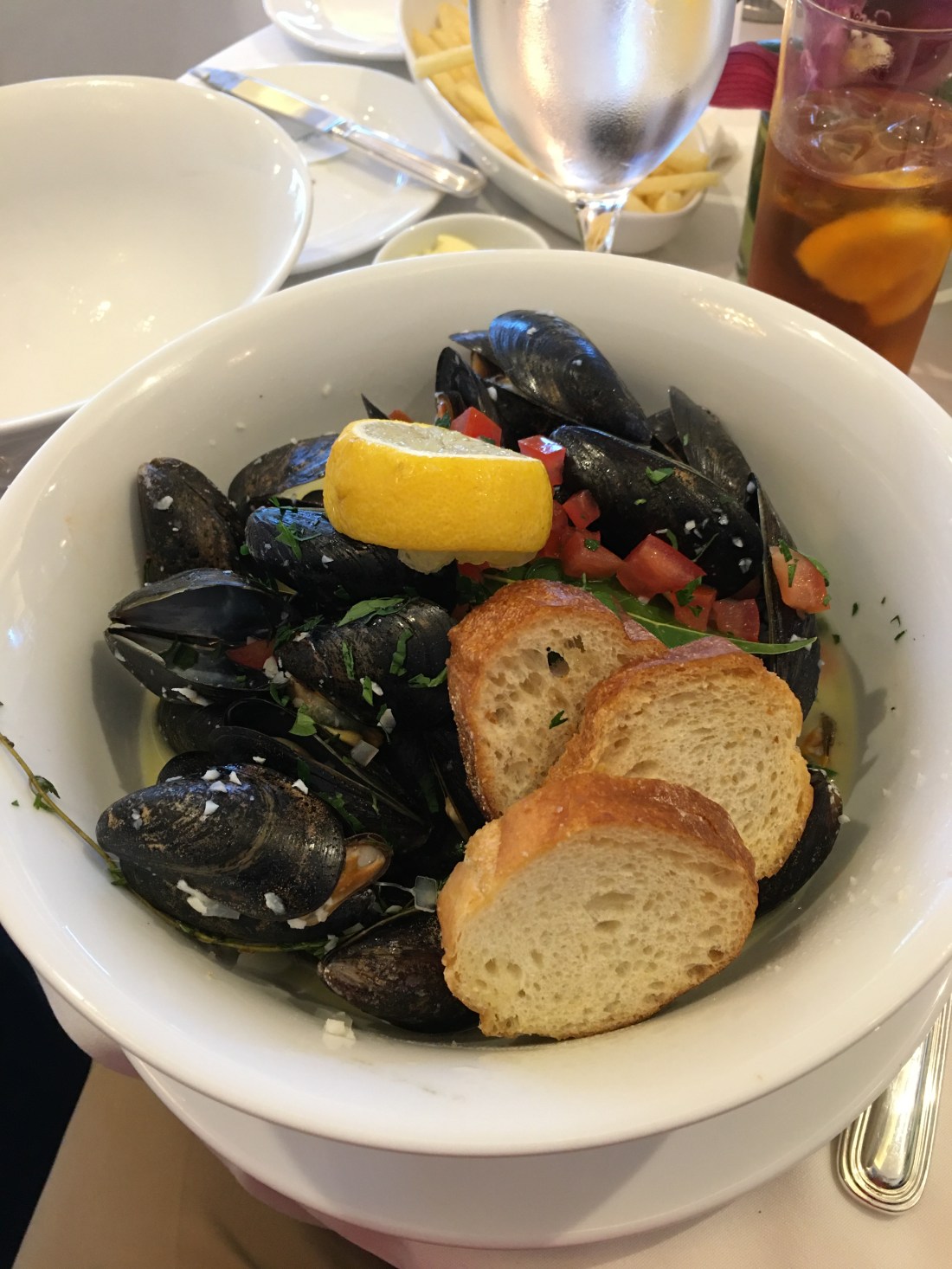 For food, we had the crab and avocado salad, mussels with french fries, chicken, and the lemon tart.
