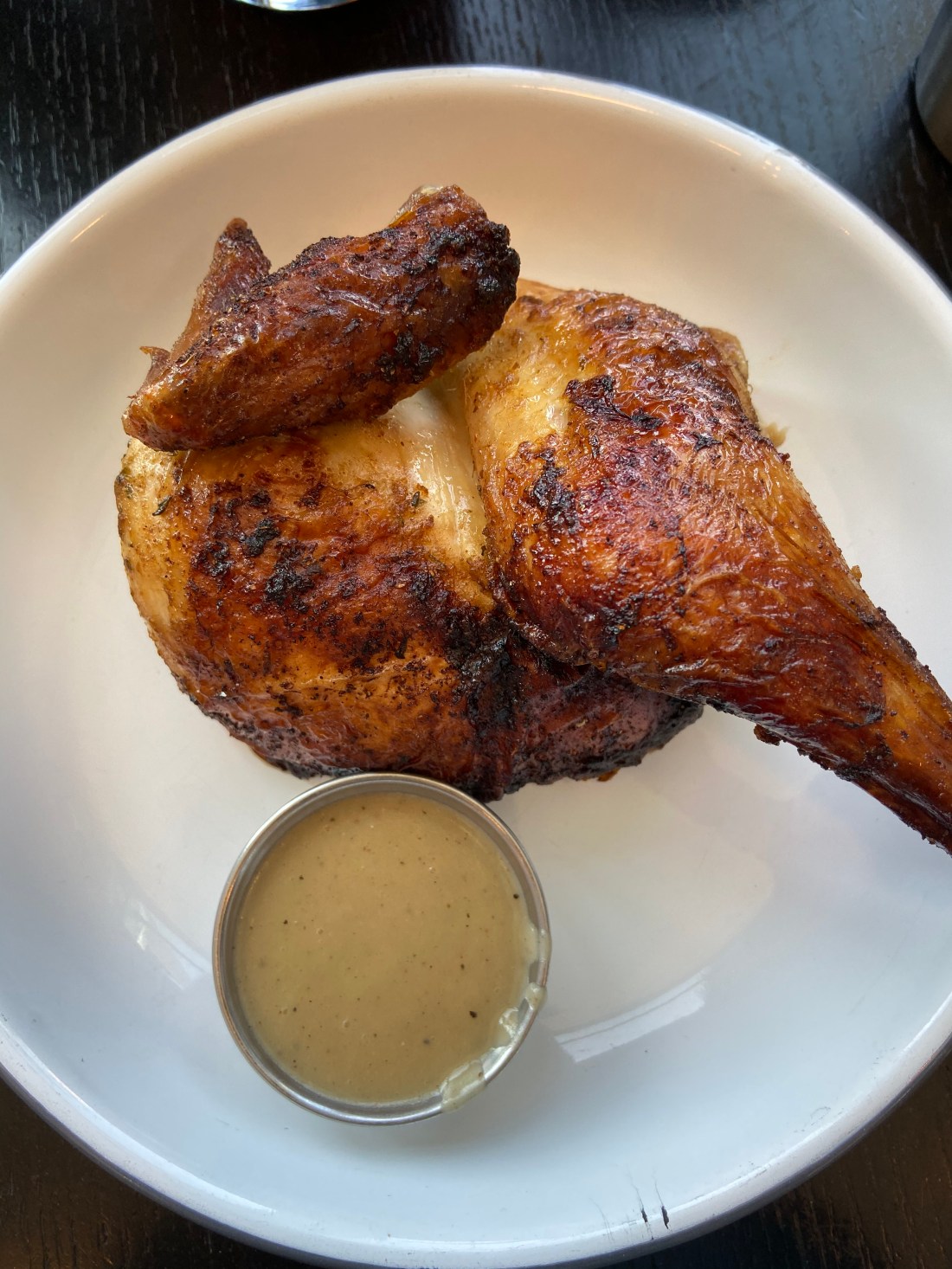 We had the following: a half of chicken with gravy, rolls, a bowl of charred veggies ( carrots, broccoli, and cauliflower ), two beers, cola, a plate of three pulled chicken sliders and dessert.