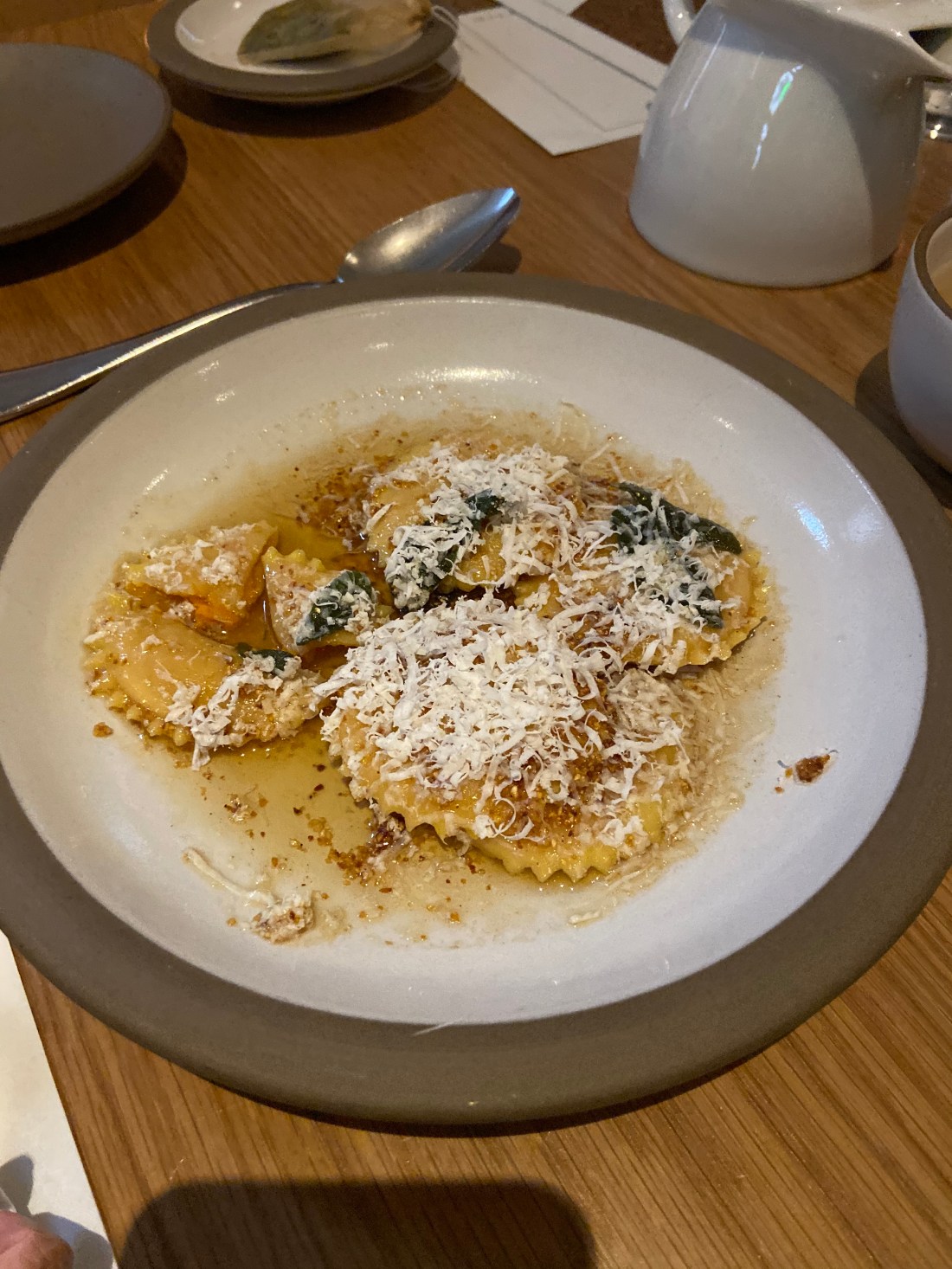 First, the tartines had figs, goat cheese, and onions. The toppings were excellent in taste but sadly the bread was too tough. Next, the Gorgonzola cheese and honey was delicious. The little dishes called Frittatine were fried balls of pasta, prosciutto, cheese, and peas. They were the highlight and one could eat a bowl. From the extensive dinner menu, the ravioli made with squash and ricotta cheese, and cooked in brown butter was very good. The dessert of the pear and chocolate crostatine was a hit. Lastly, the Poggerino Chianti selected by the sommelier was bright red and strong, perfect for a cold and snowy night. One tip as parking is very limited, you may valet park at the Bjorn Hotel next door for $10.00.