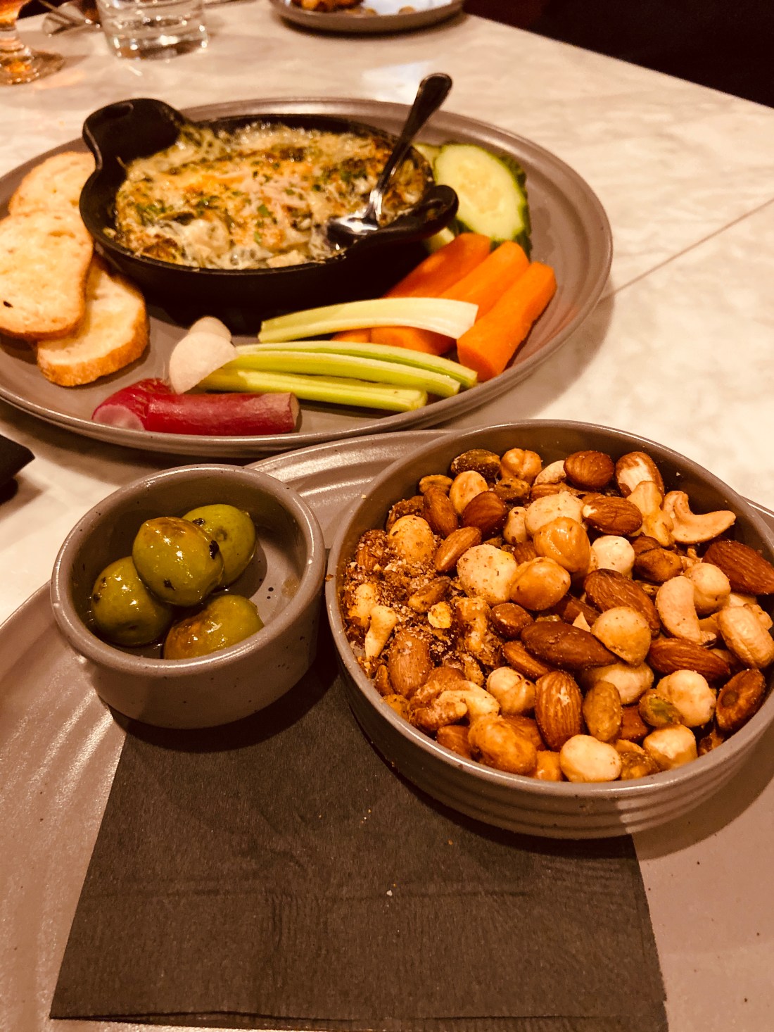 First, the appetizers starting with the olives and roasted nuts. The olives were delicious as they had a tangy flavor. Roasted nuts are just roasted nuts. The artichoke dip with vegetables and bread was just okay as the veggies were too plainly presented.