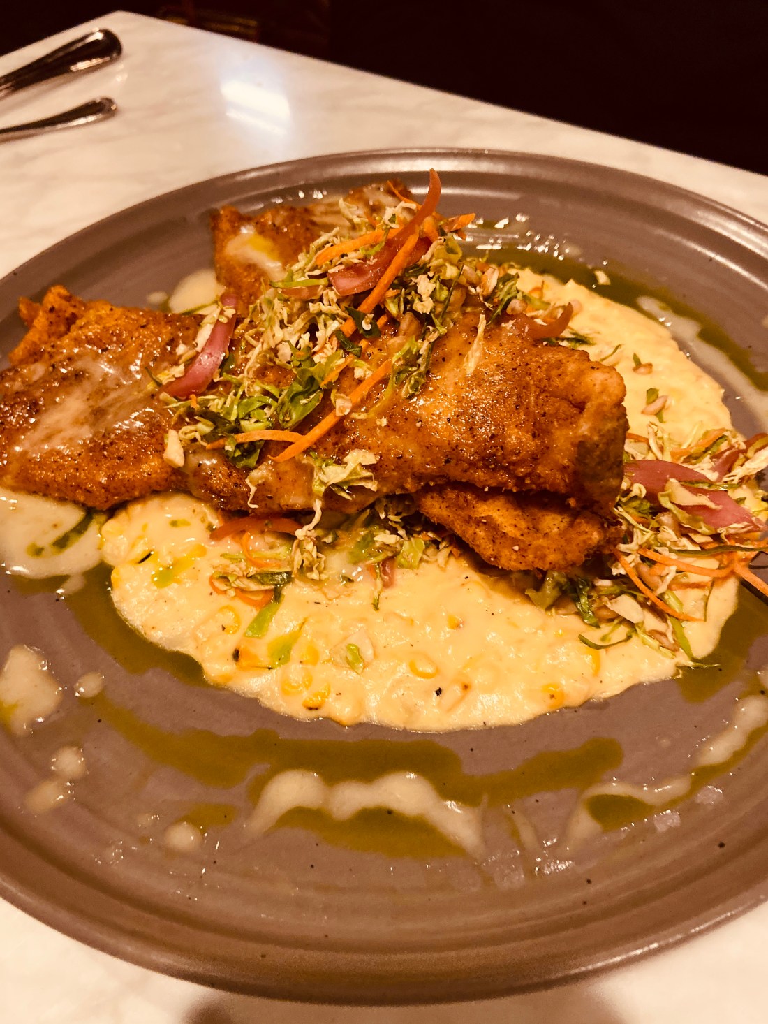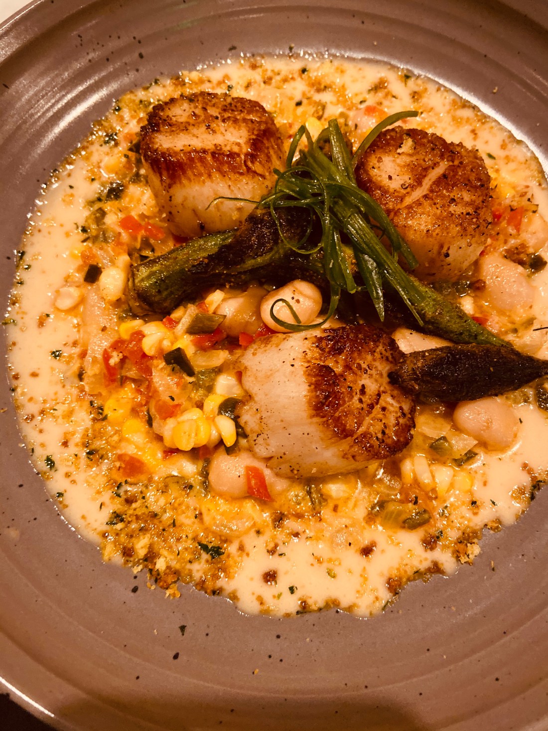 The Whole Trout was very lightly breaded and fried. The taste was very good as it was fish without the fishy taste. The Caesar Salad with chicken filled the plate but the side of chicken was too plain. It needs a little sauce or a topping of some spices. The Seared Scallops served on a plate of vegetables were delicious. The scallops were tasty as pepper and salt were present in the searing. Sadly, the Mac and Cheese was lacking a tasty cheese taste as they were drowning in bread crumbs. At an American food style restaurant., Mac and cheese should be the best and not sad.