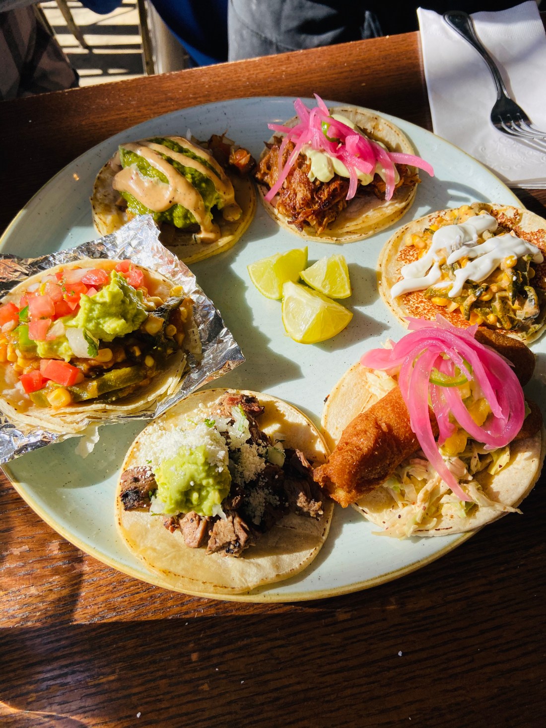 Next, the three of us had 6 different tacos from pork to vegan. The Carnitas Taco is roasted pork. The Asada is citrus marinated steak. Lenqua is triple cooked tongue. Fish N Beer is fish beer battered with pickled onions. Abril is grilled cheese with peppers. Lastly, the Vegan has sautéed spinach and peppers.