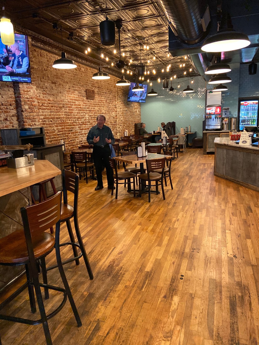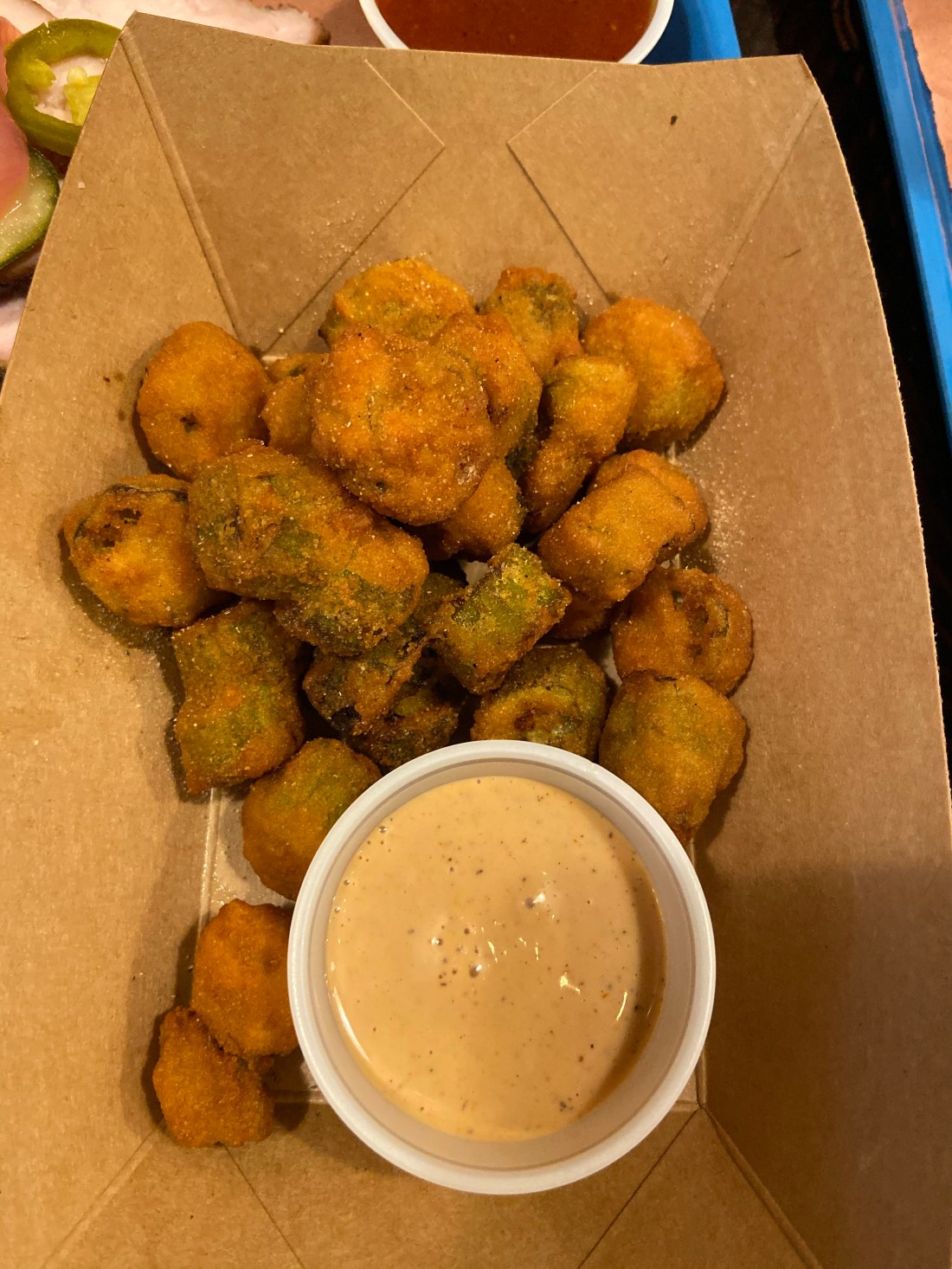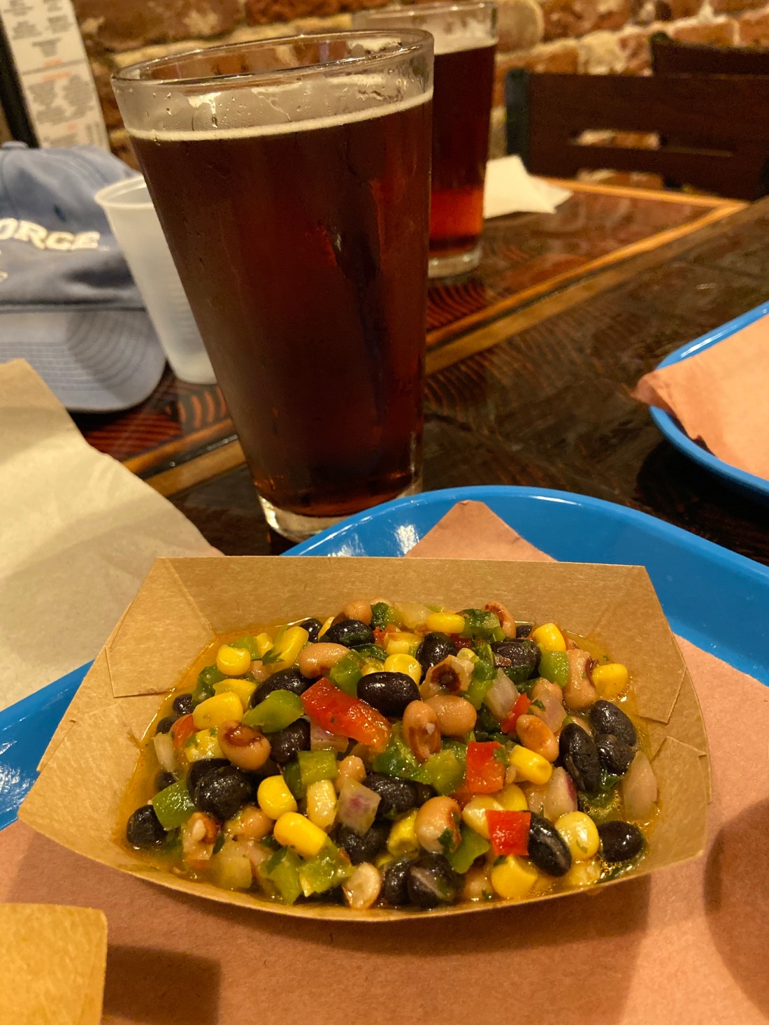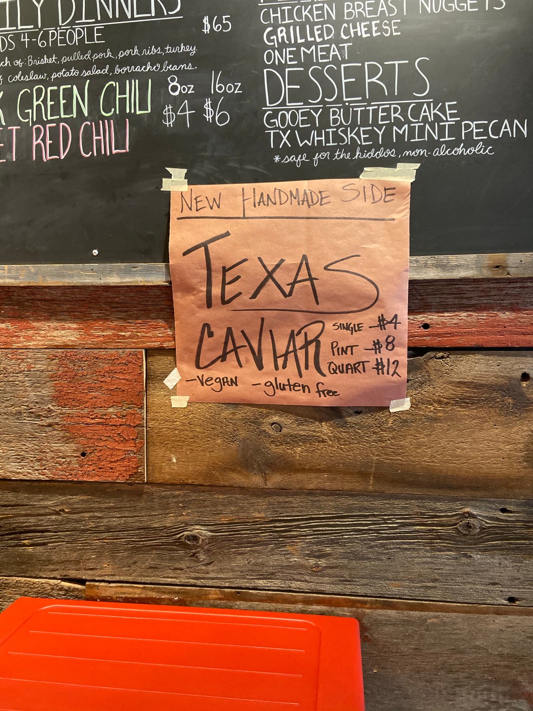 The restaurant is in a remodeled old building with a large bar. The food is ordered cafeteria style with the menu on the wall. I had to try the Texas caviar. The other items we selected were all combinations of meats and sides. The brisket and pork platter had coleslaw and potato salad. The turkey platter had fried okra and the Texas caviar. Texas ‘caviar’ is salsa with lots of beans. Everyone had to pair the meal with the bargain pint of Shiner beer for only three dollars. Great deal! Food is presented on the cafeteria tray and sitting on paper. There is no formal plates. Sandwiches are served in small paper boats. The presentation is very disappointing especially since they tasted delicious. I added pickles, onions, and jalapeño peppers to my turkey and at least it wasn’t so sad to look at. Of the four side dishes, the fried okra was the best dish as it had a very good flavor. The Texas caviar is too plain to suggest trying.