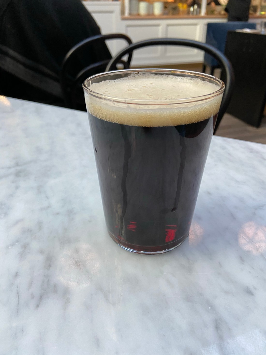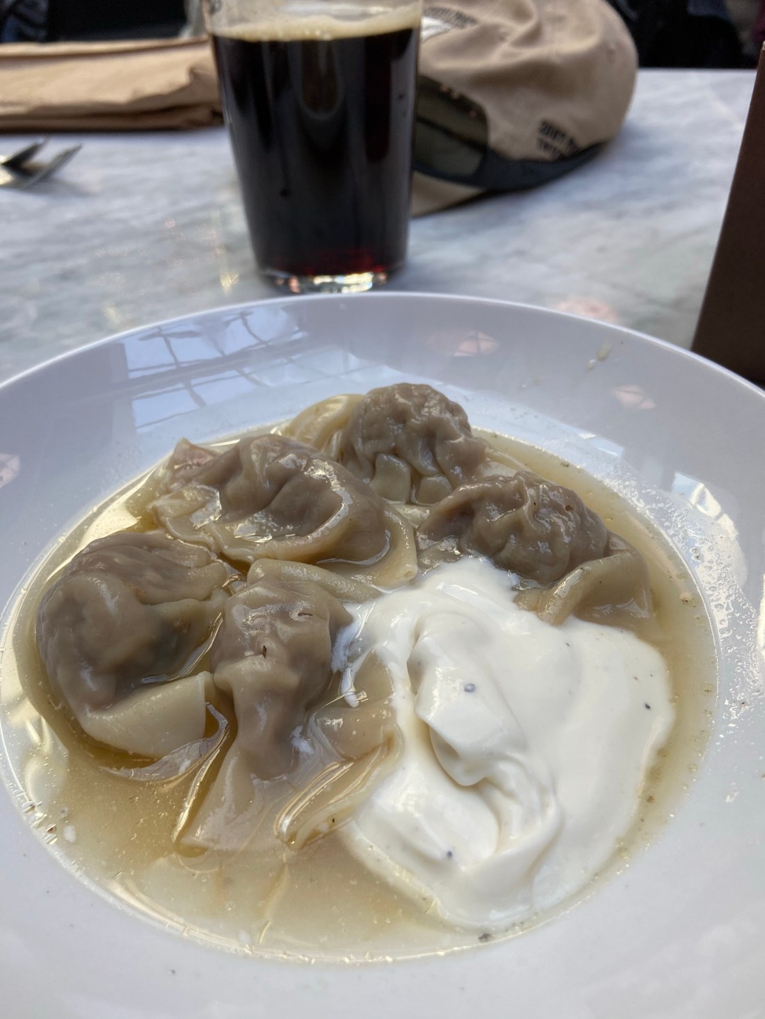 Place your order at the food counter/restaurant selected. Rather than waiting at the counter, the food is delivered table side. It’s packed at lunch time, so finding a table is about as difficult as finding a parking space. We started with an Upslope Brown Ale paired with Lithuanian Dumplings from Erida. The dumplings were great tasting but the presentation was too plain. A few pieces of Arugula lettuce or other colored item would highlight the dish. Secondly, we had the cheese plate from Folsom Foods. It was delicious and a great presentation of three cheeses. For dessert, a Blonde Brownie from Petit Fleur was very good and only white chocolate is used.