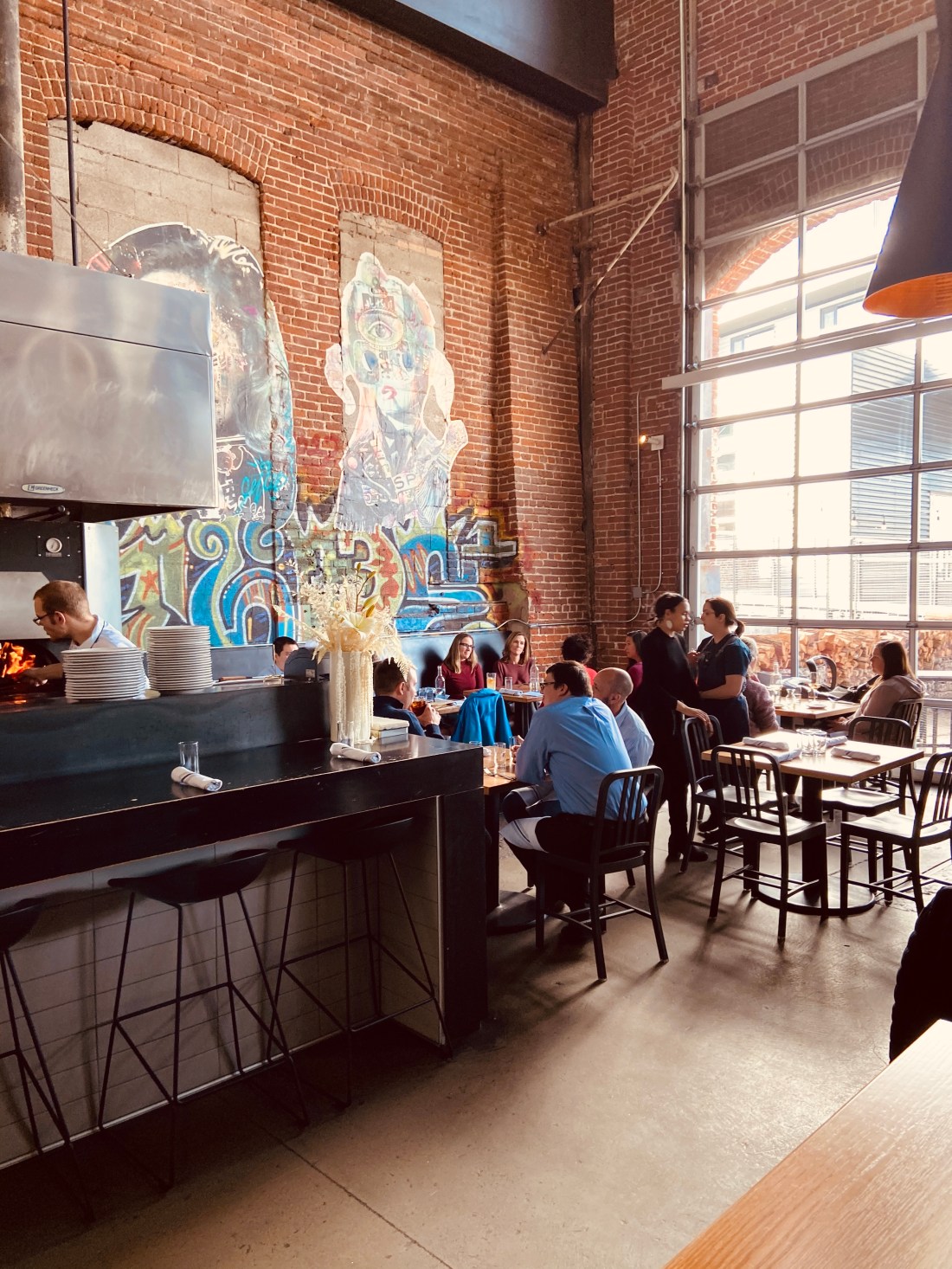 Acorn is located at 3350 Brighton Blvd., Denver, CO. inside the Old Source Iron Foundry building. Acorn is the child of the Boulder restaurant, Oak at Fourteenth, thus its name. The Source houses various other businesses including a pizza restaurant, a coffee shop, a bakery, and even a clothing store with a VW parked inside. Acorn is the probably the oldest tenant. Before you go in, check out the mural painting on 35th Ave.