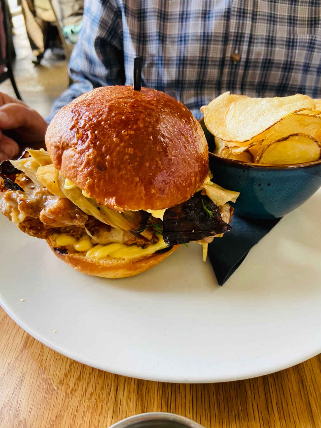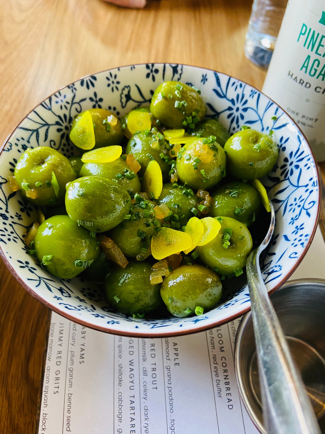 The two of us had three food items: Olives, Buttered Beans, and a Fried Chicken Sandwich. The Olives with garlic are warmed and sitting in a garlic conserve. Delicious and maybe the best olives in Denver! The Buttered Beans has a soft boiled egg sitting on top. Healthy and a good soft texture. The Fried Chicken sandwich was drizzled in Pastrami syrup. What is Pastrami syrup? The server explained it is the drippings when the meat is cooked. A small bowl of potatoes chips is served as a side. The chicken was very tasty but could use more Pastrami syrup.