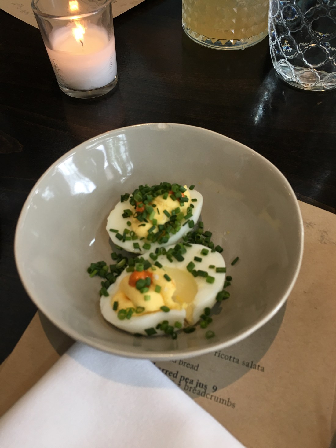 Two of us started with a cocktail named, “odmjuk”. Swedish for humble, as it’s essentially alcohol and lemonade. A good summer drink. We started with the deviled eggs as a snack (pictured).