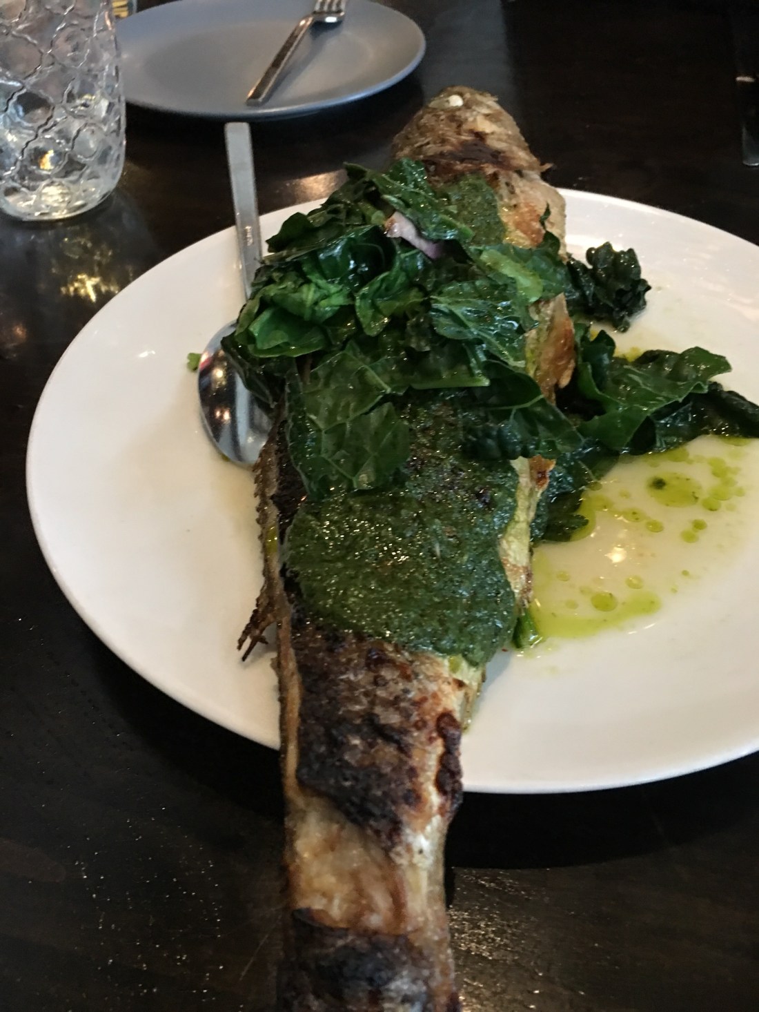 The main dish was the roasted whole fish (ocean bass) with kale, salsa verde, and chiles. The fish was deboned at table side by staff.(pictured).