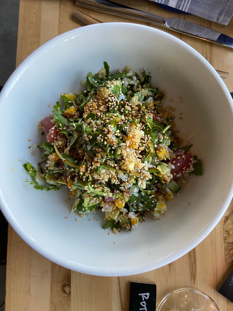 The food selected was a grilled cheese sandwich and tomato soup, a classic winter time dish. Secondly, a tuna poke salad was picked. Both had a very good presentation and taste to match. The sandwich had lots of cheese. The tuna was in a large bowl filled with vegetables and greens. Very good.