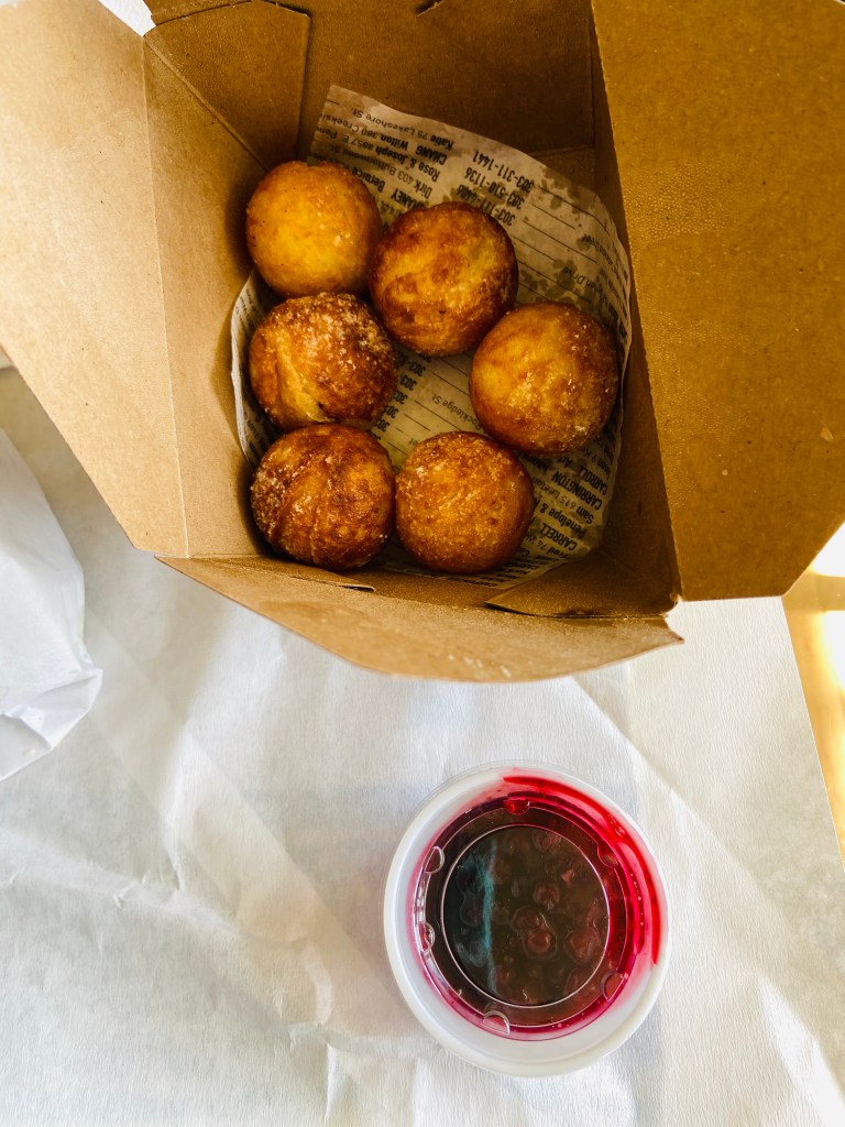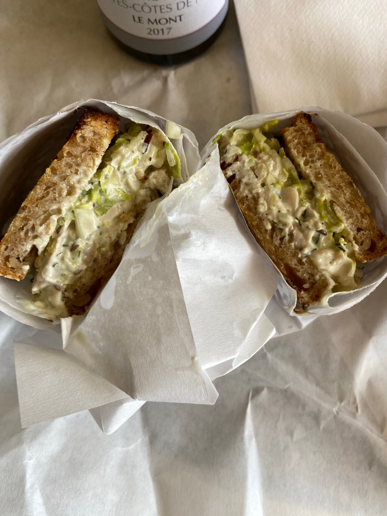 We ordered online and the food was delivered curbside. Call is Scandinavian-based focusing on small dishes. First, the Aebleskever which is Danish for snacks in round shapes. Essentially, warm pancake puffs with ricotta cheese and fruit preserves. The other item was the World Famous Chef Duncan Holme’s Chicken Salad Sandwich. We also included a bottle of French Burgundy wine but I could not drink a fancy French wine for lunch, so I paired the sandwich with a Hercules Beer.
