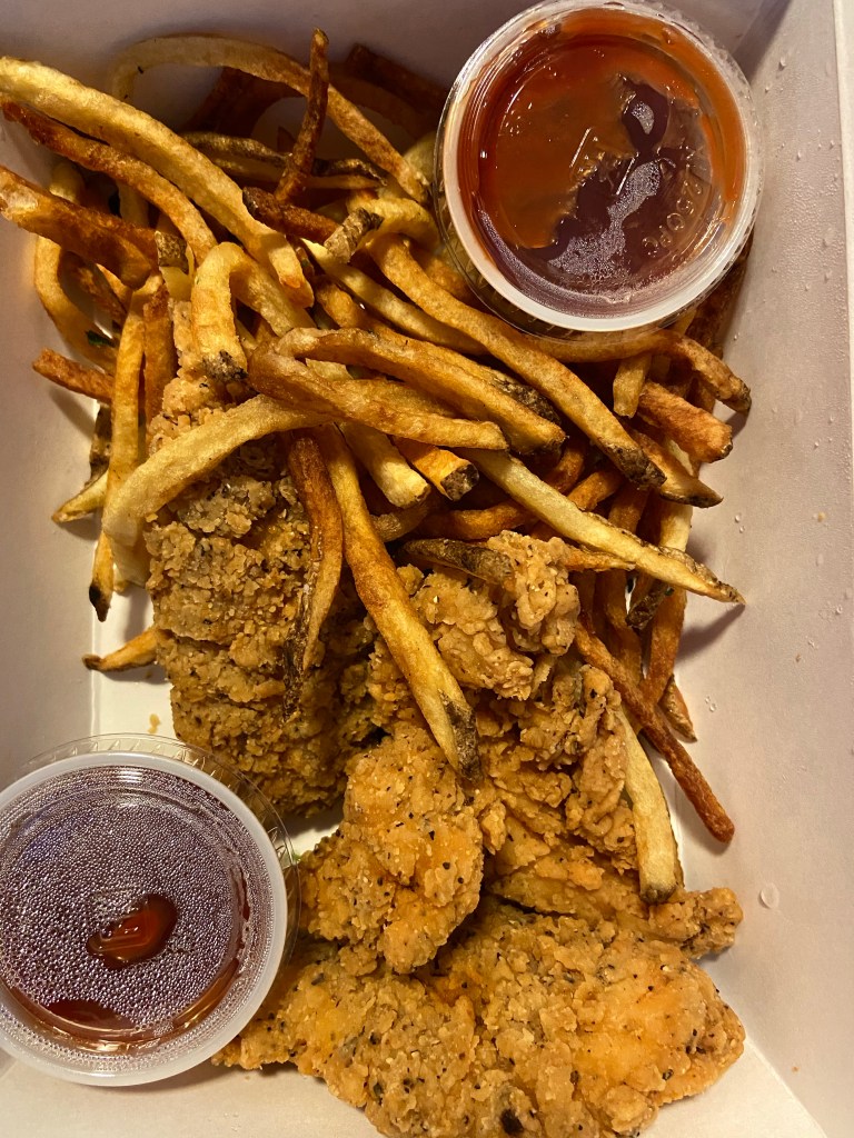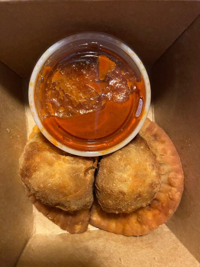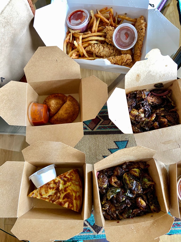 We called ahead for an order of brussels sprouts, chicken fingers, beef empanadas, potato tortilla, and a bottle of wine. The crispy brussels sprouts have been grilled with pickled red onions and lime on top, not only a very healthy snack but great tasting. The chicken fingers with french fries were still warm when opened at home. This was the largest box and a very inexpensive item, only $7.50. The beef empanadas were sided with red pepper sauce. Very tasty. Lastly, the potato tortilla was an item I have never tried. It’s a fancy potato omelette where the potatoes are sliced very thin and stacked. It was matched with olive oil sour cream and was the surprise of the dinner. It was excellent.