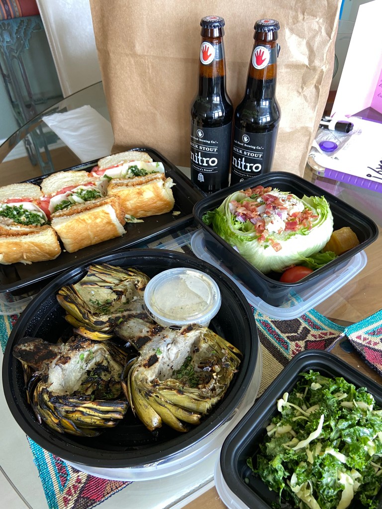 We enjoyed a take away dinner of grilled artichokes, iceberg wedge salad with bacon, and a crispy chicken sandwich with a side of spicy coleslaw. Also, we added two bottles of Nitro beer by Left Hand Brewing.