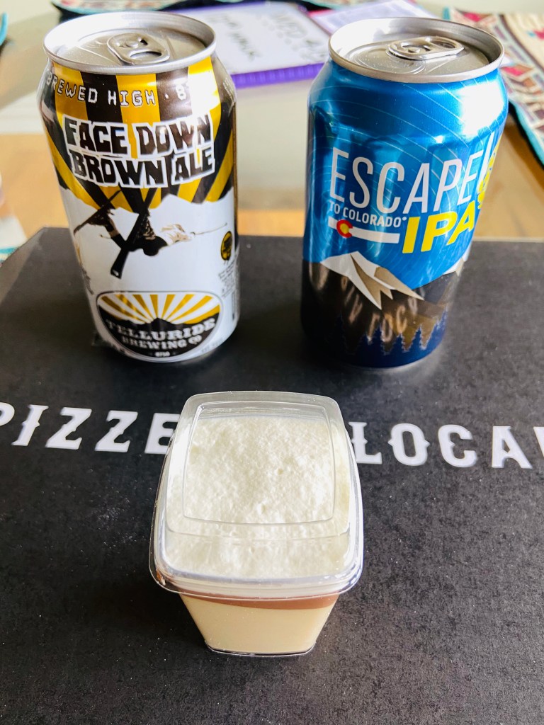 We had a second take away for the evening from Pizzeria Locale on Broadway. A margarita pizza for only $6.25 has red sauce, mozzarella, and fresh basil. Very Italian and delicious. It was still warm when we arrived home. We also had Budino for a tiny dessert. It’s butterscotch with caramel on top. Once again, it will satisfy your need for sweet. Two beers were added and the Face Down Ale was my favorite as it reminded me of my snowboarding days and surviving several face down falls.
