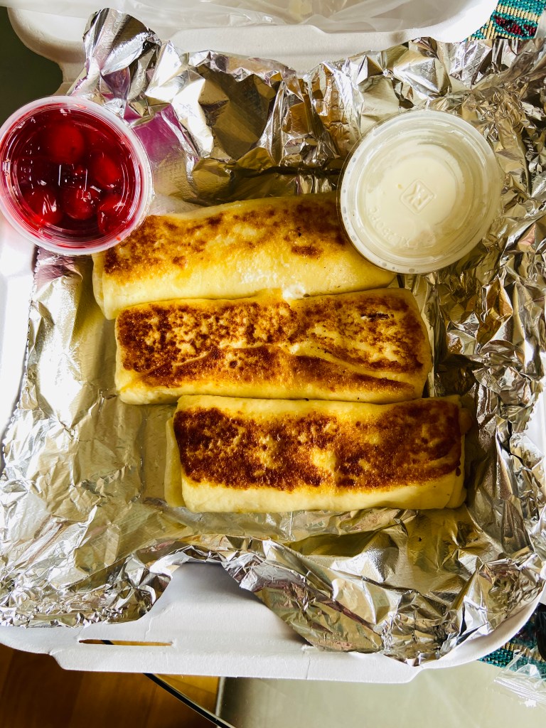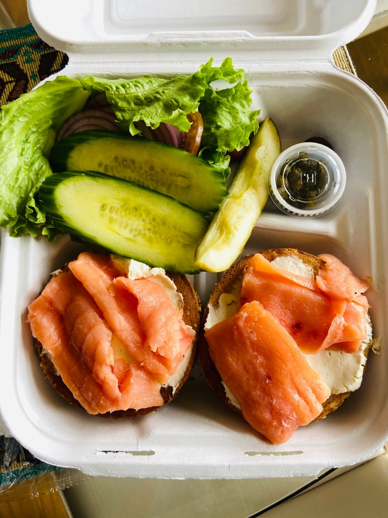 The Bagel Deli has been open since 1967. It was featured on the Food Network’s TV show, Diners, Drive-Ins, and Dives. Besides food to go, they also have groceries and many other deli items. We ordered via the telephone and requested a bagel with cream cheese and lox and three cheese blintzes.