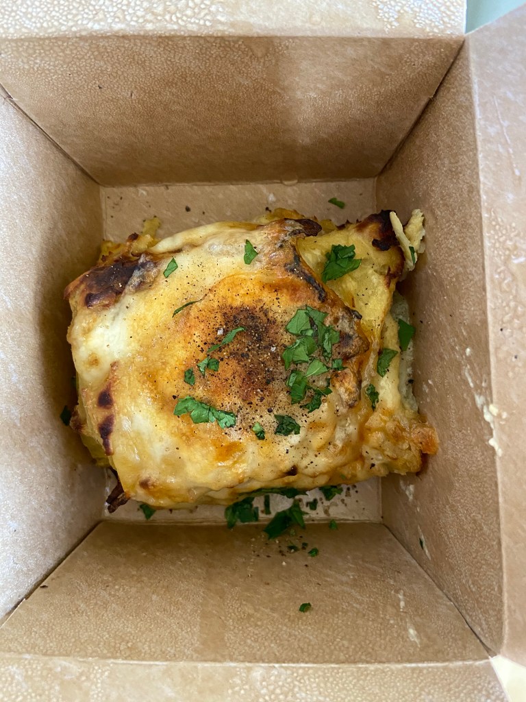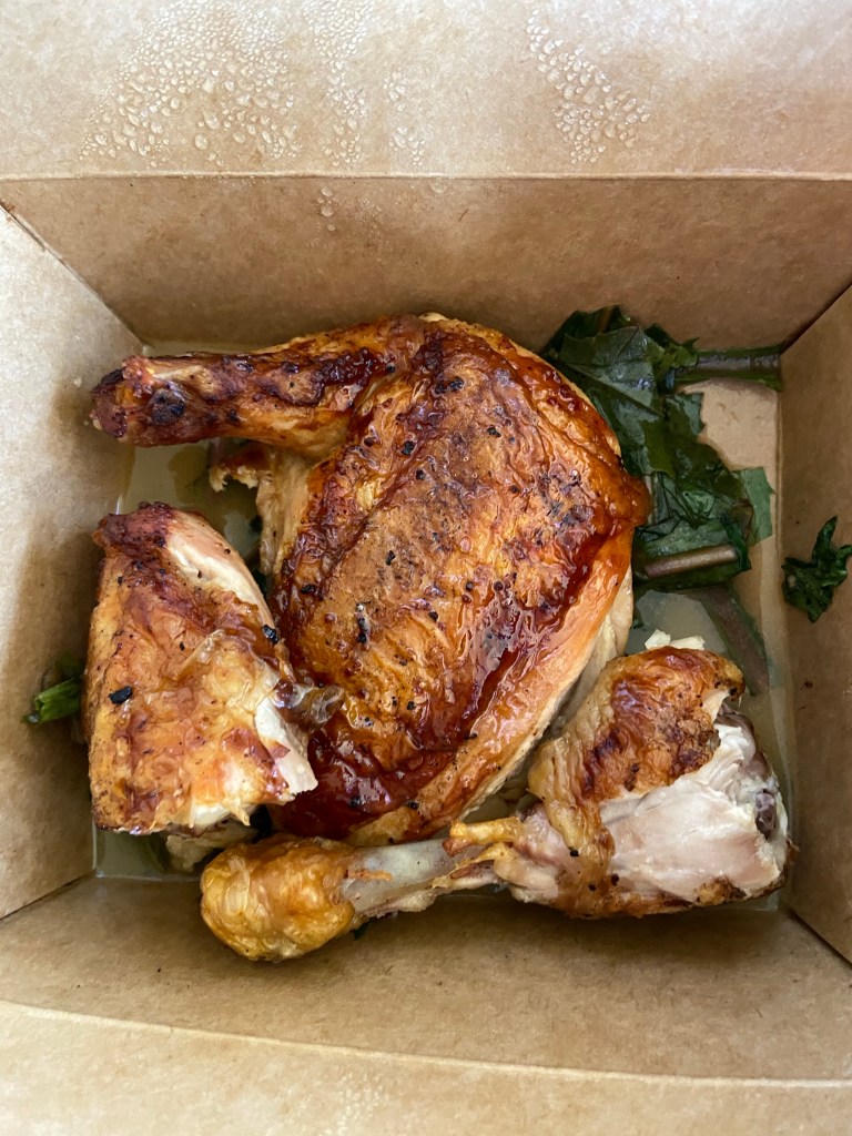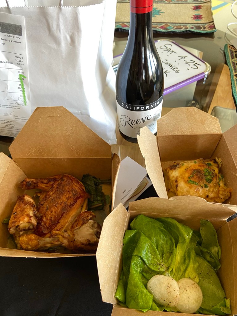 We ordered the wood fired roasted 1/2 chicken dinner. It included a potato gratin dish and a side salad. On arrival, the food is delivered curbside and after you hold up your name on a sign in the windshield, the food is placed on the car’s hood.