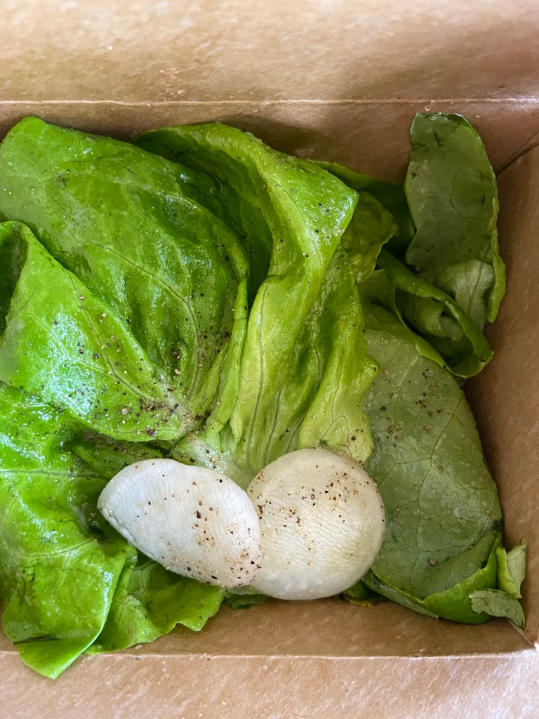 The chicken was delicious. It was very tender and moist. In the take away box, it sits in lots of juices and green sautéed kale. The gratin dish is filled with potatoes, mild leeks, and Taleggio cheese. It was still warm when we arrived at home. The cheese adds a great flavor to the potatoes. The side salad of butter leaf lettuce with shaved radishes and pickled shallot vinaigrette was delicious as the tart flavors against the potatoes and chicken were a hit.