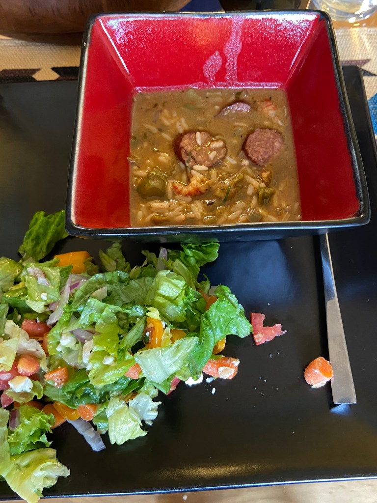 The Crawfish and Andouille sausage gumbo with green peppers, okra, scallions, and white rice was good. We did not provide enough time needed to fully fuze the flavors together.