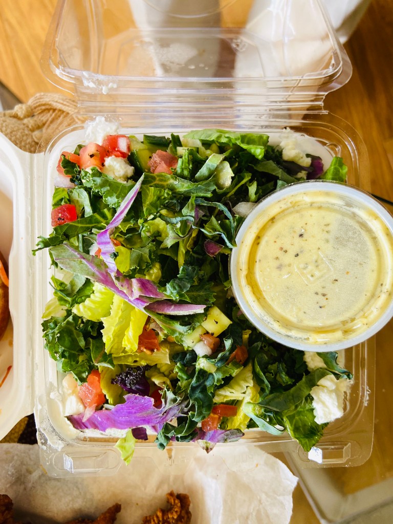 First, the Buffalo Sandwich had the largest tomato slice seen in Denver. The Sandwich was spicy and with beer, it was a perfect match. The 5 Chicken Tenders were tops. I wish we had ordered extra hot sauce for dipping. Next time. The Tenders themselves were excellent. Lastly, the side salad was good and very healthy.