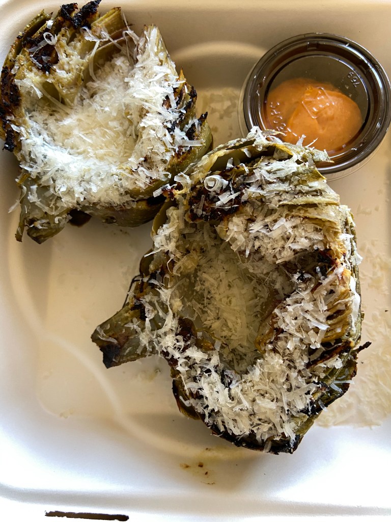 The Charred Artichoke had grilled garlic butter, parmesan cheese, and a bright orange chili aioli for dipping. The artichoke was good. Remember, you will need extra napkins to eat grilled artichokes.