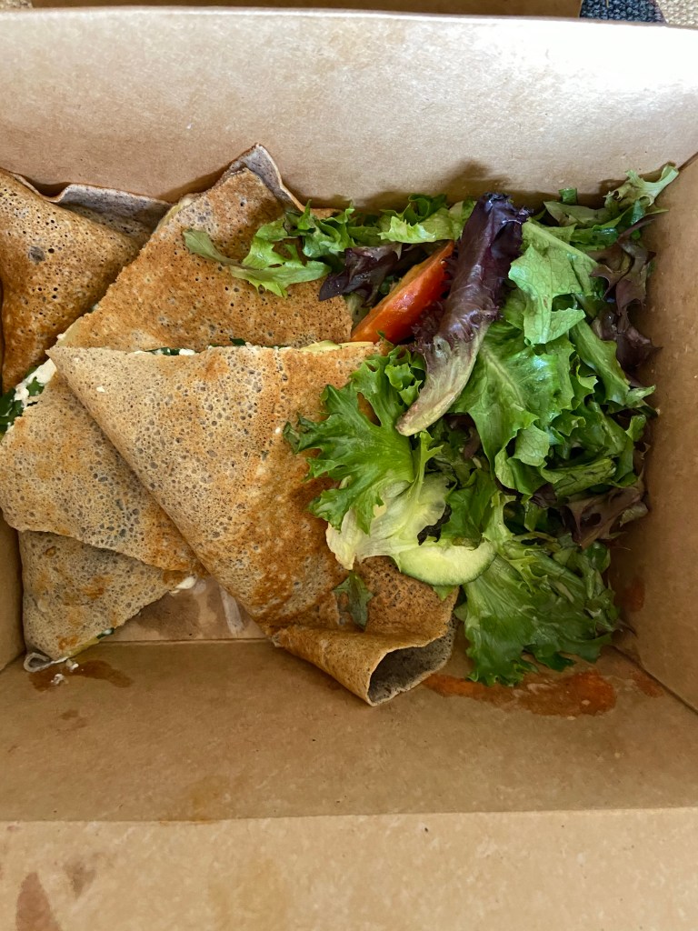 The Vegetarian Provencale Crepe has spinach, roasted eggplant, zucchini, and cheese inside the buckwheat crepe. A small side salad is included. The crepe was still warm when we arrived home and was described as very good.