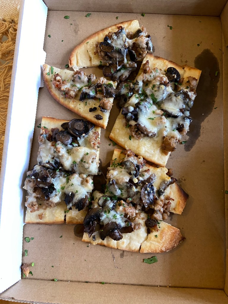 First, the Grilled Asparagus had a truffle-parmesan fondue sauce on top. One voted the asparagus as the best dish of the evening. Next, the Flat Bread with the house -made Italian sausage and mushrooms was very tasty and there was enough for seconds.