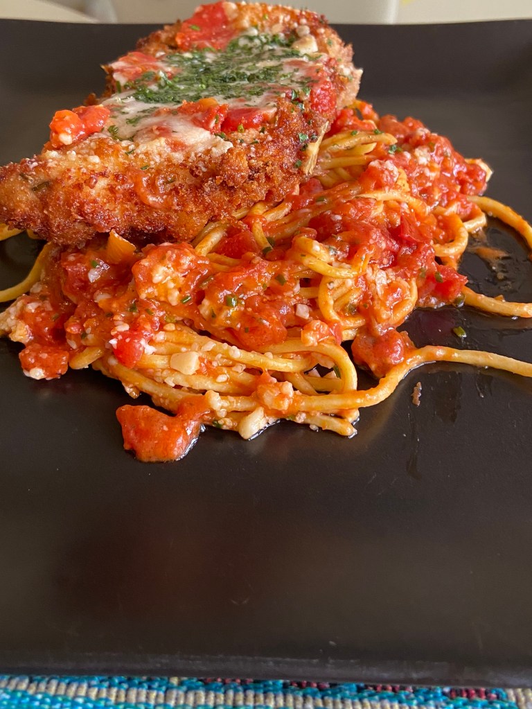 It’s twin, Chicken Parmesan, was similar in presentation to the Eggplant but even larger in size. The chicken had a very good taste with all the tomatoes. Again, enough for two!