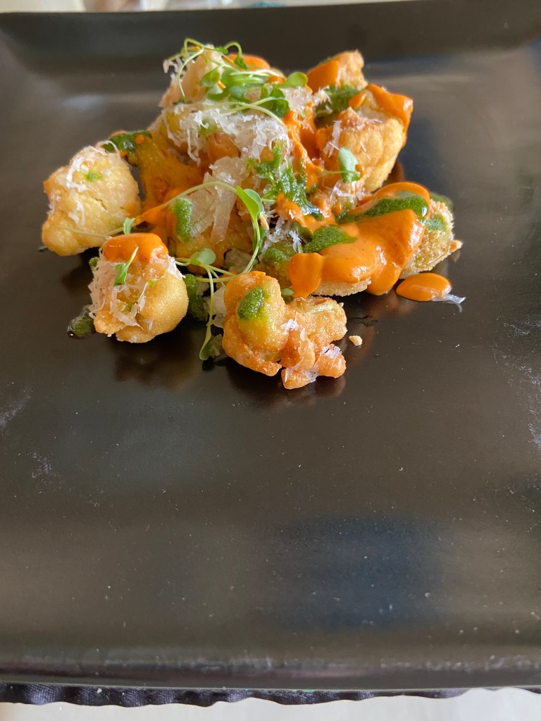 The crispy cauliflower and green tomatoes includes pickled watermelon, almonds, cheese, and cilantro was very good in taste but did not stay warm enough after a drive home. That’s one problem with the takeaway dinners but one diner selected it as the best dish of the evening.