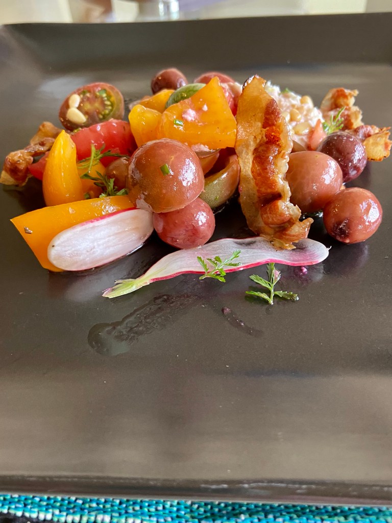 The heirloom tomatoes with smoked grapes, pine nuts, stracciatella cheese, and baby green melons was a great tasting small dish. The smoked grapes added an interesting and new flavor to the tomatoes.