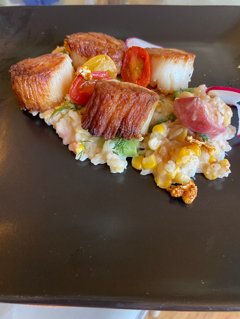 The Seared Scallops with blistered tomatoes, radishes, and corn risotto had a beautiful presentation and the large scallops were delicious. They were cooked just right, with a sear on the outside and light inside.