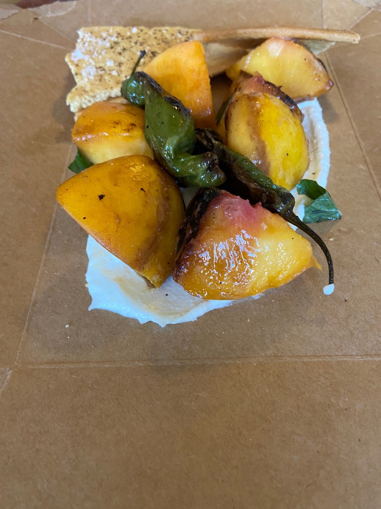 The presentation in the takeaway boxes was superb. In fact, you wanted to eat out of the box. For example, the peaches and peppers were placed on a layer of ricotta cheese in the box. Beautiful!