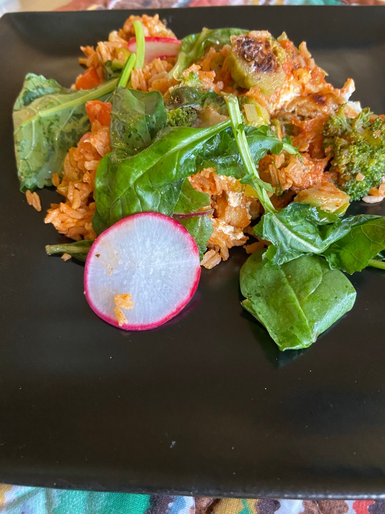 The Spanish rice is roasted in an iron skillet with lots of vegetables added to the rice and then topped with goat and manchego cheeses then flipped over for serving. Garnished with spinach and radishes, it’s a great presentation. The two cheeses not only hold things together but add a great flavor. It was the best dish of the evening. A half order is even plenty for three servings.