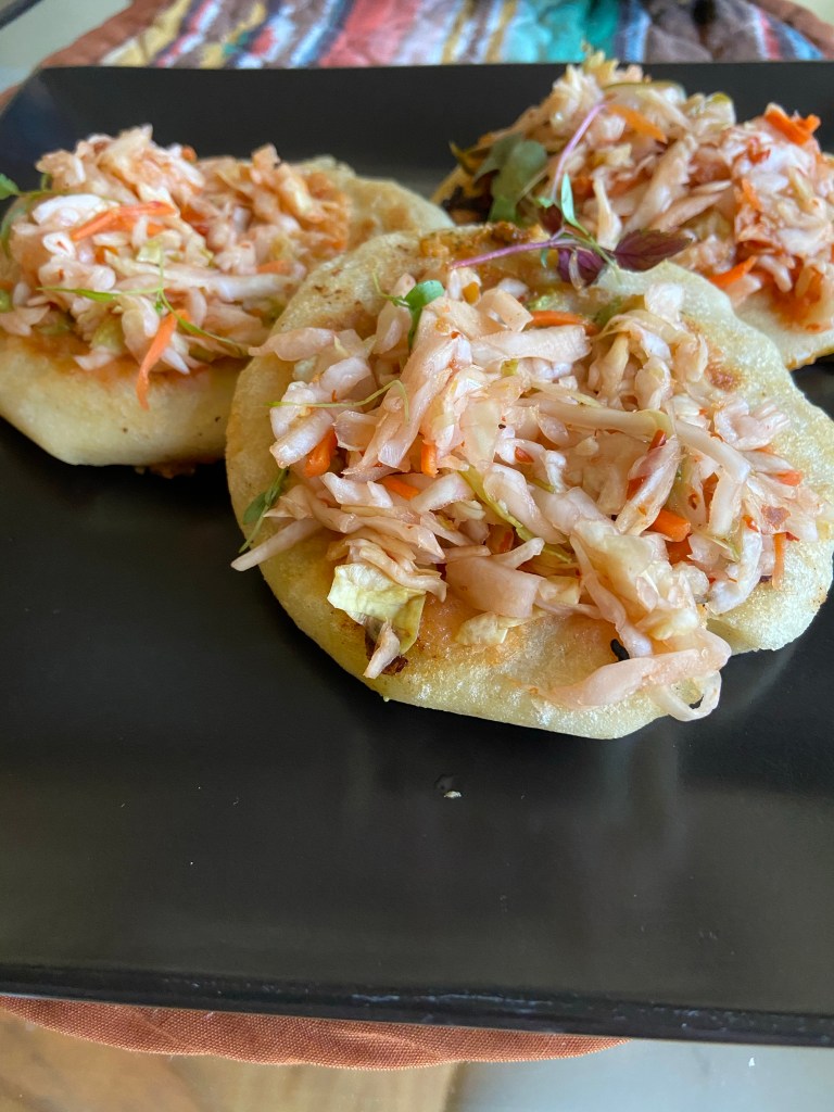 The pupusas are essentially soft-shelled tacos without meat but use spicy vegetables and cheese. They were delicious but Mile High Dining suggests you have a cerveza ready to dampen the spicy cole slaw and peppers.