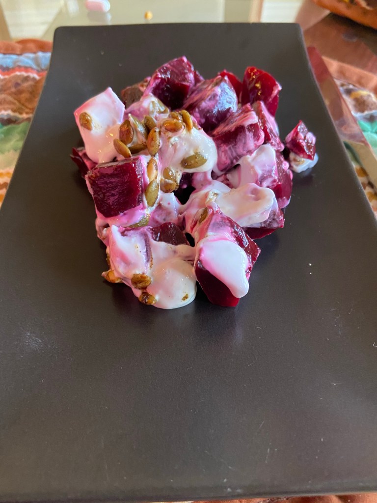 The beet salad has Mexican lemon crema with beets and pickled cherries. A mild tasting beet salad but works very well next to the spicy pupusas. Crema cheese holds everything together.