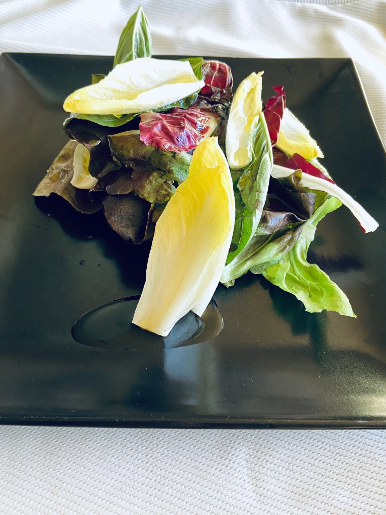 The tricolored salad had a great presentation with the red, light green, and dark green lettuce. It had a very good taste with the light dressing but it was hard to eat because of the large size of the lettuce leaves.