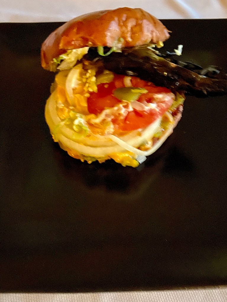 The first new dish was a vegetarian burger. It was a house-made patty with onions, lettuce, tomato, mayo, and added cheese and green chile. It tasted like a regular beef burger but the mayo made all the other ingredients too mushy to enjoy. The mayo needs to be in a separate container until you get home to apply. We are learning that takeaway meals sometimes need extra help. We enlisted assistance from roasted Hatch’s chiles.