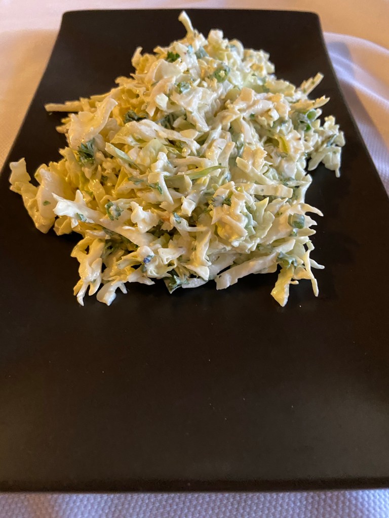 The coleslaw was good looking but lacked much taste. It needed some extra color from carrots or other vegetables and extra vinegar for taste.