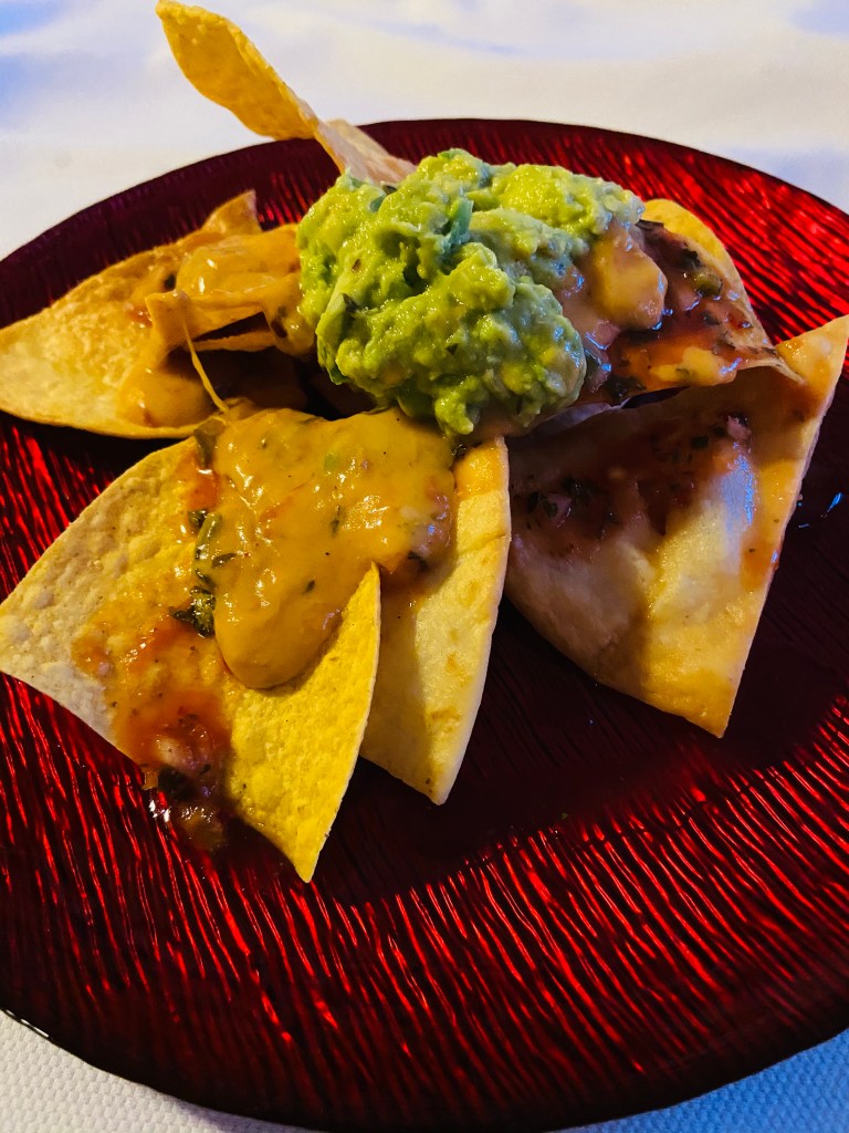 For starters, the Blue Bonnet platter has extra-large flour chips with salsa, cheese, and guacamole sides. The large chips are great for dipping. The restaurant even added some extra chips which we saved for the Bronco football game.