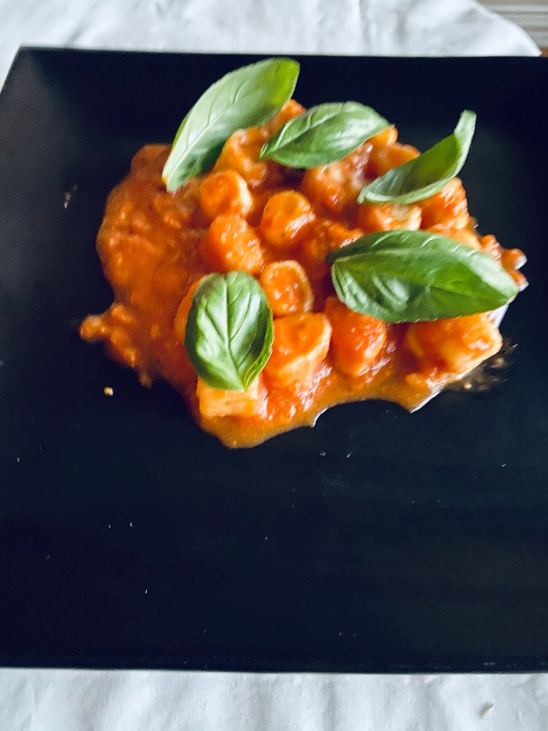 The gnocchi had the best presentation. It had tomato sauce, garlic, basil, and mozzarella cheese. Mile High Dining added fresh basil leaves to brighten the dish. The gnocchi had a great tomato flavor.