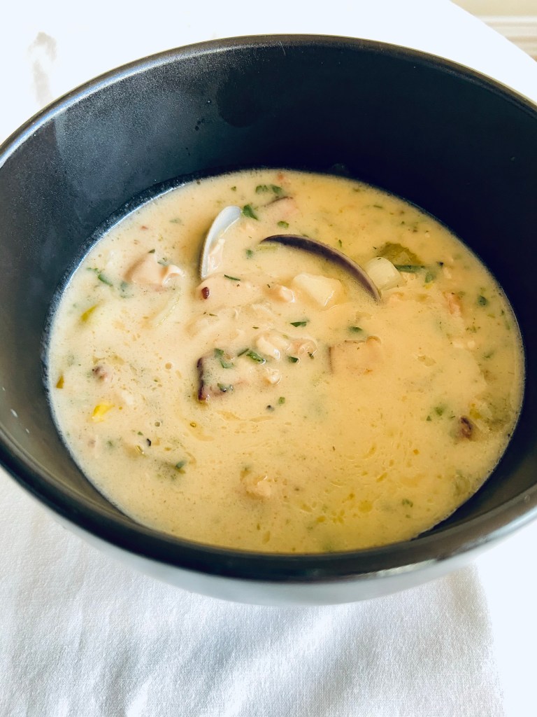 The clam chowder with crackers was warm and filled with lots of seafood. Very good!