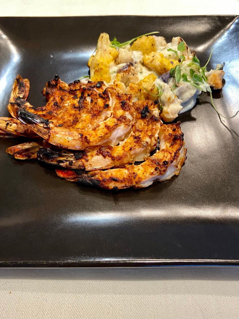 The main entrée of the Diablo shrimp had extra-large shrimp with cilantro cauliflower rice. The shrimp were a little spicy but the puréed cauliflower made a great combination. A very good dish.