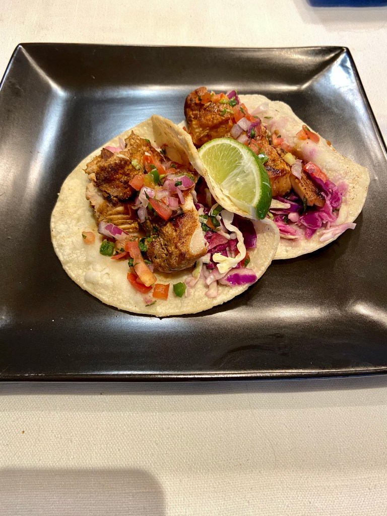 The two grilled fish tacos had chili rubbed mahi-mahi fish with cilantro, lime, and a slaw. Very good taste but by the time we got home, the tortillas were too soggy and the tacos fell apart. It’s suggested that takeaway tacos need to add a lettuce leaf on top of the tortilla as I had to use a fork to eat the tacos.