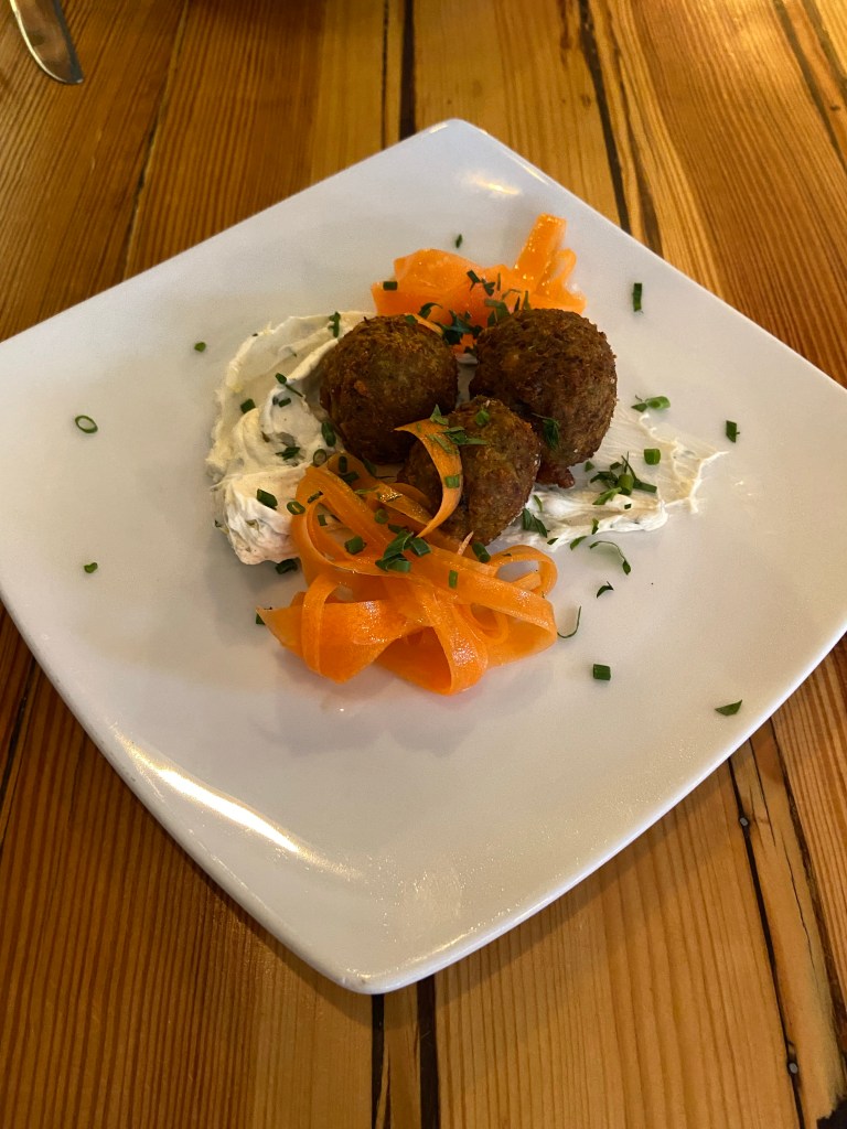 The pea fritters were paired with lemon cheese and thin-sliced pickled carrots. The fritters dipped into the lemon cheese were very good especially plated with the paper-thin bright orange carrot slices.