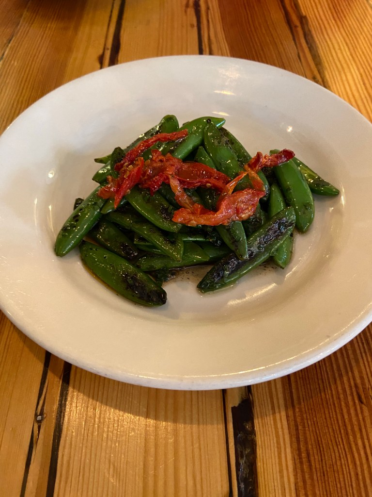 The blistered snap peas with tomatoes, herb butter, and a touch of chili oil were a great way to enjoy this spring dish.
