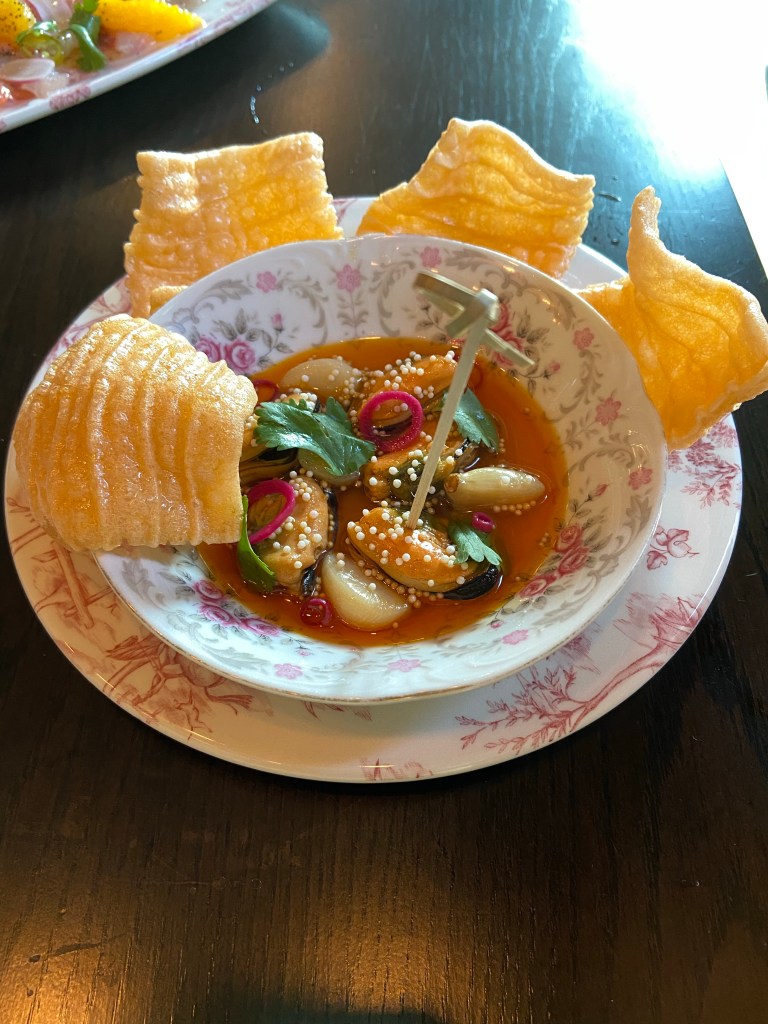 The mussels escabeche ( marinated) with garlic, paprika, and cilantro with chicharron ( fried pork) was a new way to serve mussels. Sadly, the mussels were lost in the process.